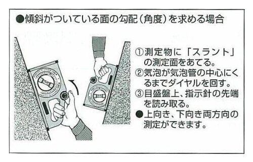 ●勾配(角度)測定・勾配(角度)設定の2通りの使い方が可能です。●【用途】●土木・建築工事用勾配計。●【機能・特徴】●法勾配及び角度対照表付です。●握りやすくシンプルなデザインです。●読みとりやすい大きな目盛数字仕様です。●【仕様】●高精度アルミ底面仕様。●最小読取角度:2度。●測定範囲:130度、-0度、-130度。●目盛仕様:内側2度通し、外側1分~8分(0.5分目盛通し)。●法勾配及び角度対照表付。●【材質】●本体:アルミ。●本体ケース:ABS樹脂。●気泡管:アクリル。●【商品サイズ】幅125×高さ250×奥行25mm 重量300g●商品コード:4975364040831●JANコード:4975364040831●ブランド名:タジマ●商品名:スラント100●規格:SLT-100●【注意事項ほか】●万が一気泡管の破損等による液漏れで身体に液が付着した場合は直ちに清浄な水で洗い流して下さい。目に入った場合は眼科医の手当てを受けて下さい。