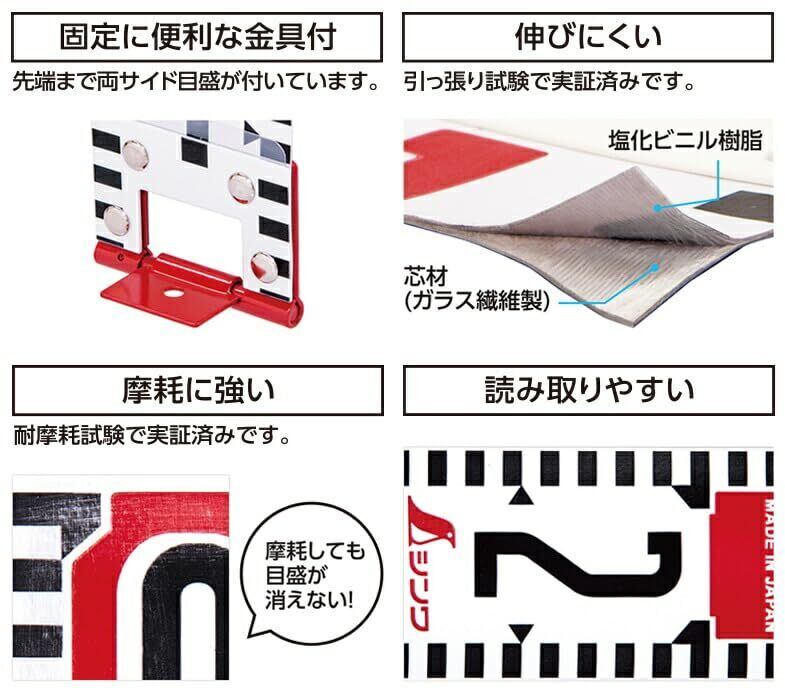 JIS1級品です。 芯材にガラス繊維を使用しているので伸縮しにくくなっています。 固定に便利な金具付です。 摩耗で目盛が消えにくい仕様になっています。