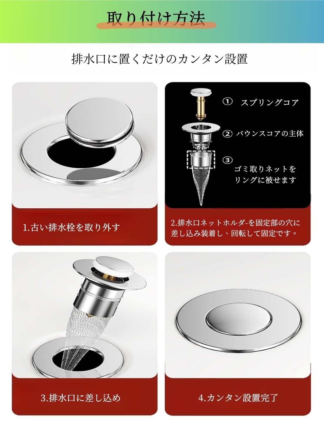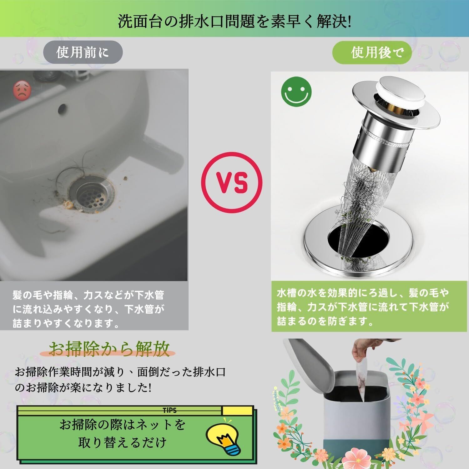 【304ステンレス採用・純銅コア】:最新改良した洗面台用排水栓です。蓋部分は高品質ステンレス鋼製で錆にくい。ゴミ受けはネットを使用するのでお掃除はネットをさっと交換するだけ。ぬめり汚れを擦ったり、しつこくからまった毛を取る必要が無くてお掃除はとても簡単です。