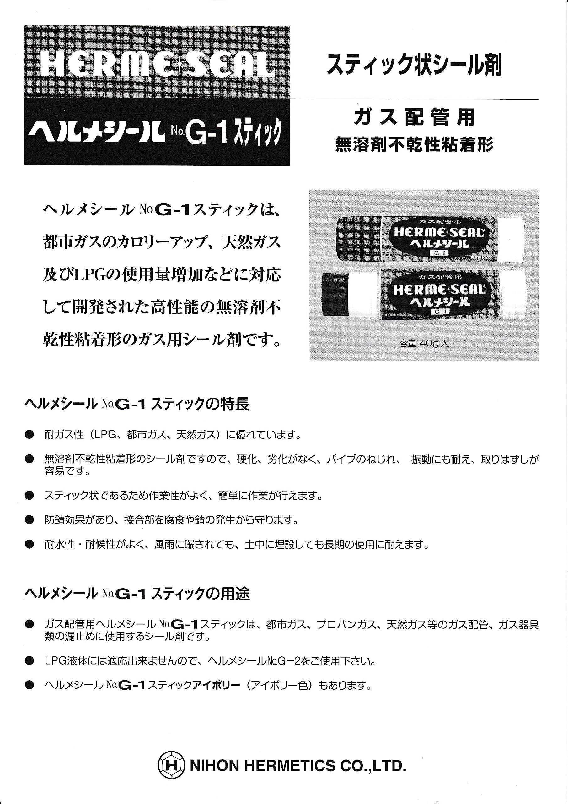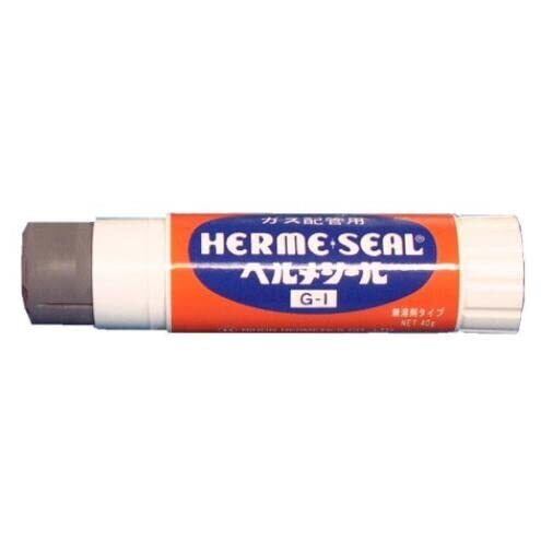 日本ヘルメチックス ヘルメシール G-1 スティック グレー 40g ガス配管用スティック状シール剤 ●耐ガス性(LPG、都市ガス、天然ガス)に優れています。●無溶剤不乾性粘着形のシール剤ですので、硬化、劣化が少なく、パイプのねじれ、振動にも耐え、取りはずしが安易です。●スティック状であるため作業性がよく、簡単に作業が行えます。●防錆作用があり、接合部を腐食や錆の発生から守ります。●耐水性・耐候性がよく、雨風に曝されても、土中に埋設しても長期の使用に耐えます。
