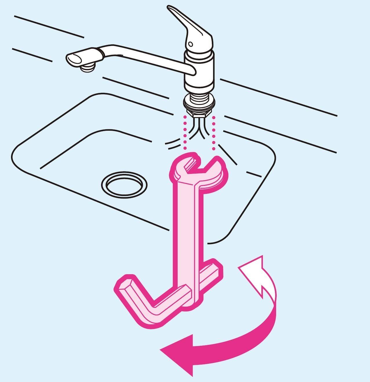 【立形締付工具】対辺46mmのナット式ワンホール混合栓等のロックナットの取り付けや、取り外しの際に使用します。シンク下のスペースは大変狭く、横に回転させる通常のスパナ等ではうまくロックナットを回せない場合があります。立形締付工具は長さ200mmと長く、少ないスペースでもロックナットの取り付け、取り外しが行えます。