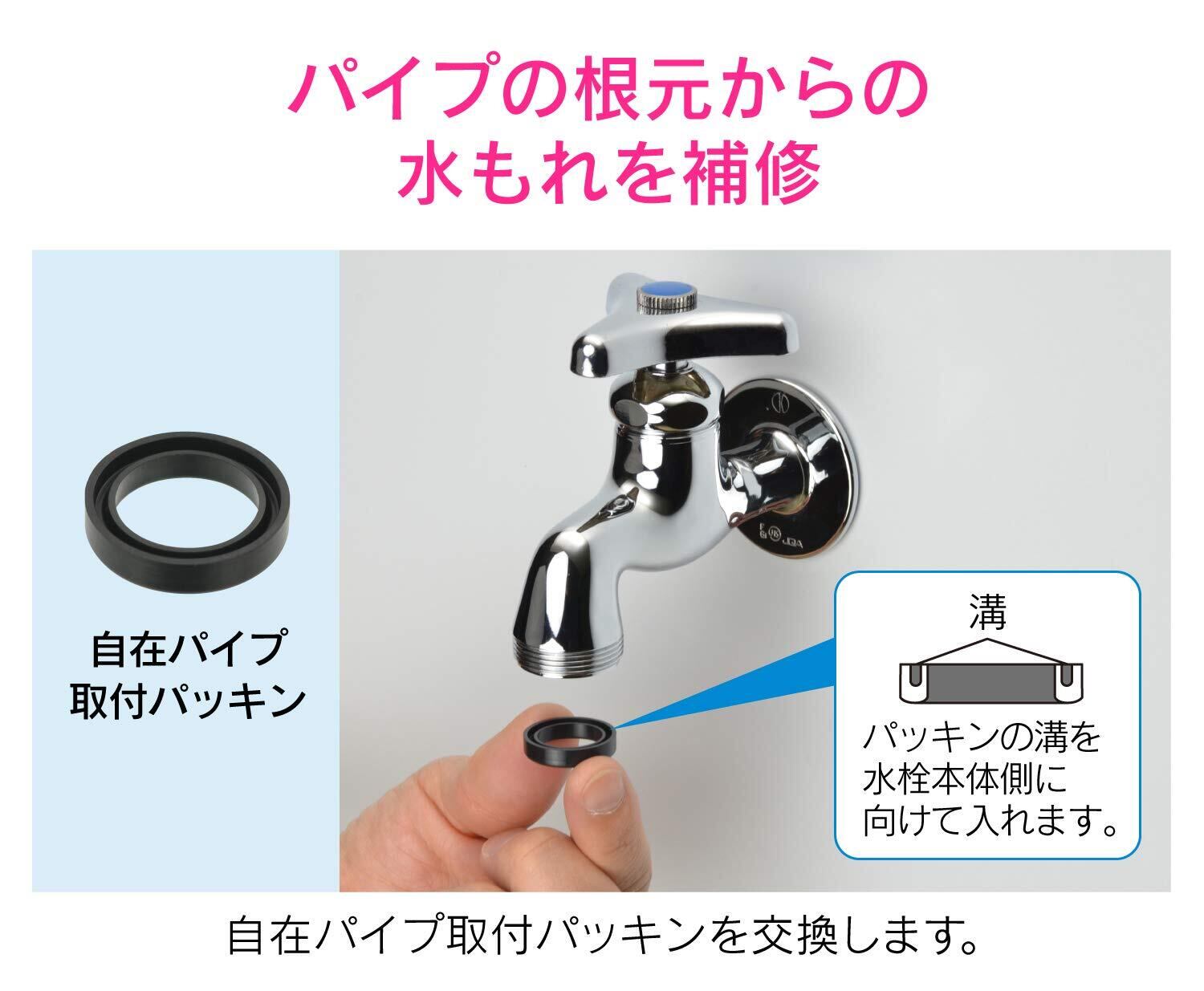 自在水栓の修理に必要な部材のセット【用途】呼13の蛇口自在水栓の修理作業【特徴】・これ一つあれば呼13の蛇口の修理は安心・吐水口からの水もれはゴムつきケレップまたは水栓パッキンで補修できる・パイプの根元からの水もれは自在パイプ取付パッキンで補修できる・ハンドル下ナットからの水もれは水栓ハンドル内パッキンで補修できる・水栓と壁の間からの水もれはシールテープ(1m)で補修できる
