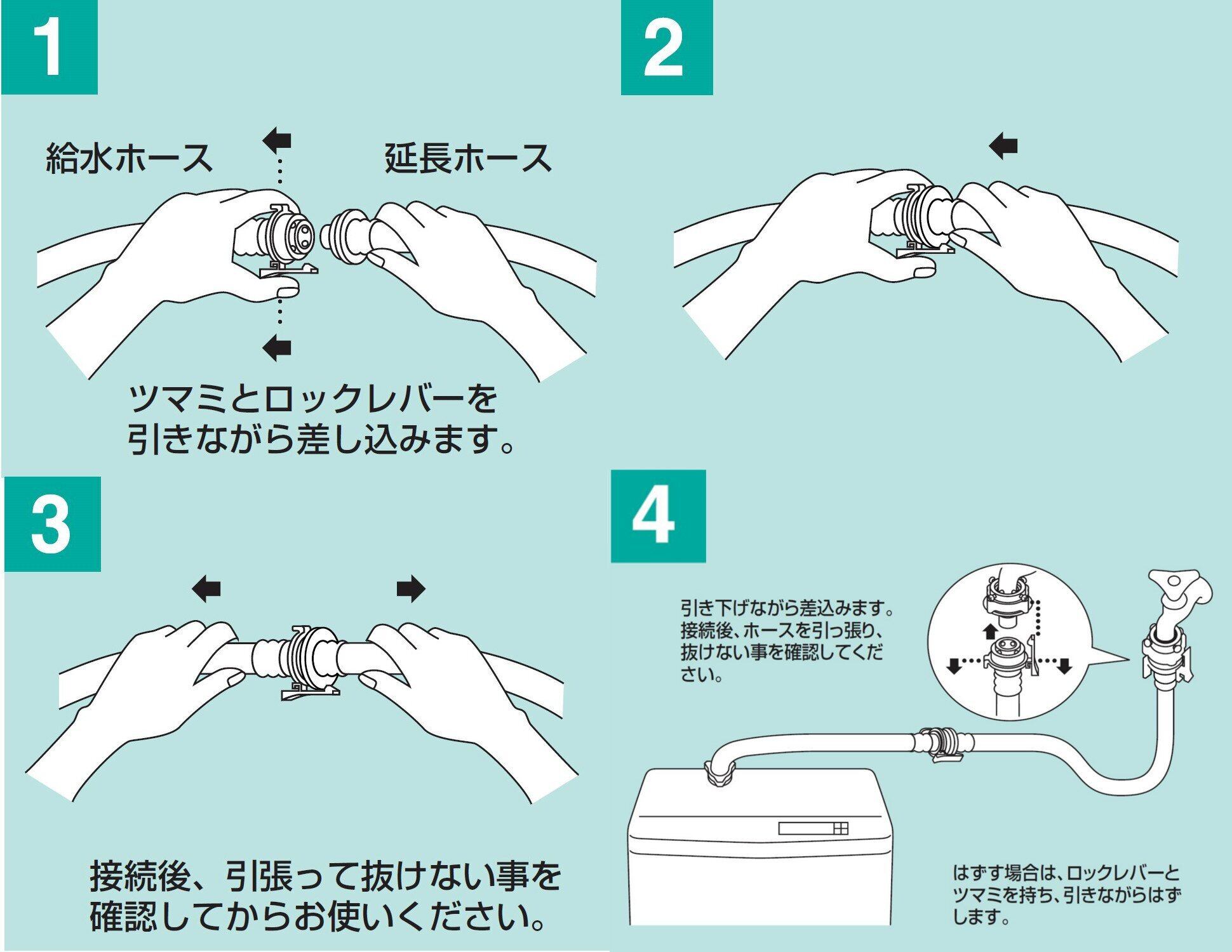 【取付方】給水ホースのつまみとロックレバーを引き下げながら延長ホースに差し込みます。接続後、ホースを引っ張って抜けない事を確認してからご使用ください。延長ホースの反対側もつまみとロックレバーを引き下げながら洗濯水栓または洗濯ニップルに差し込みます。接続後、ホースを強く引っ張り、抜けない事を確認してからご使用ください。外す場合はロックレバーとつまみを持ち、引きながら外します。