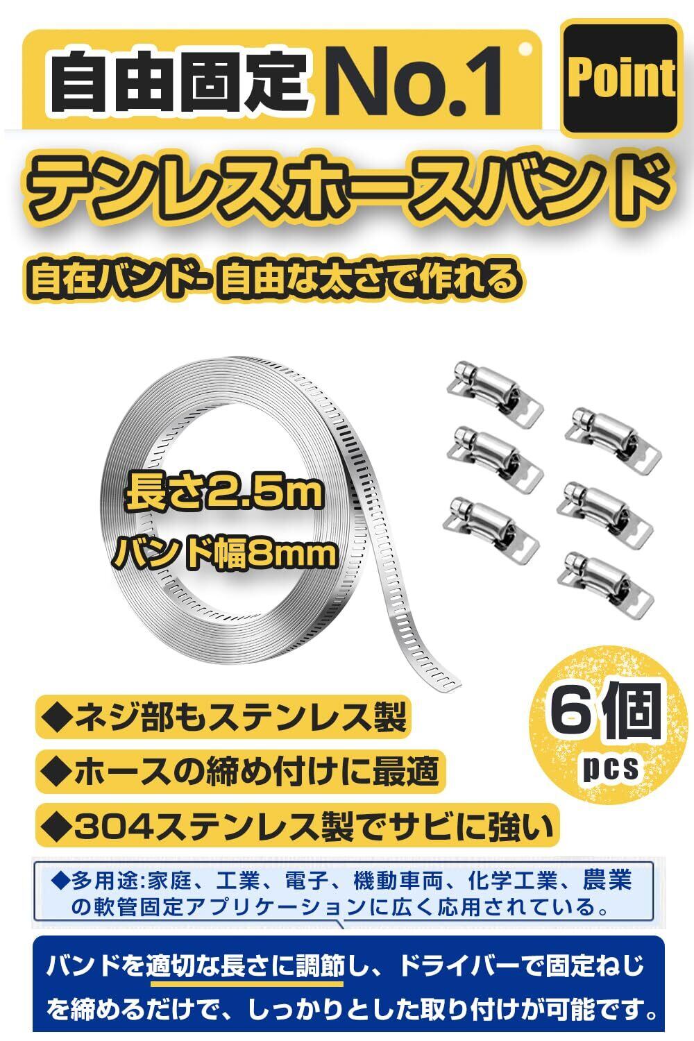 【新着商品】ホースバンド マフラーバンド 自在バンド 強力オール ホースクランプ テンレスホースバンド 304ステンレス鋼 強力固定 長さ2.5m 幅さ8mm 留め具 6個