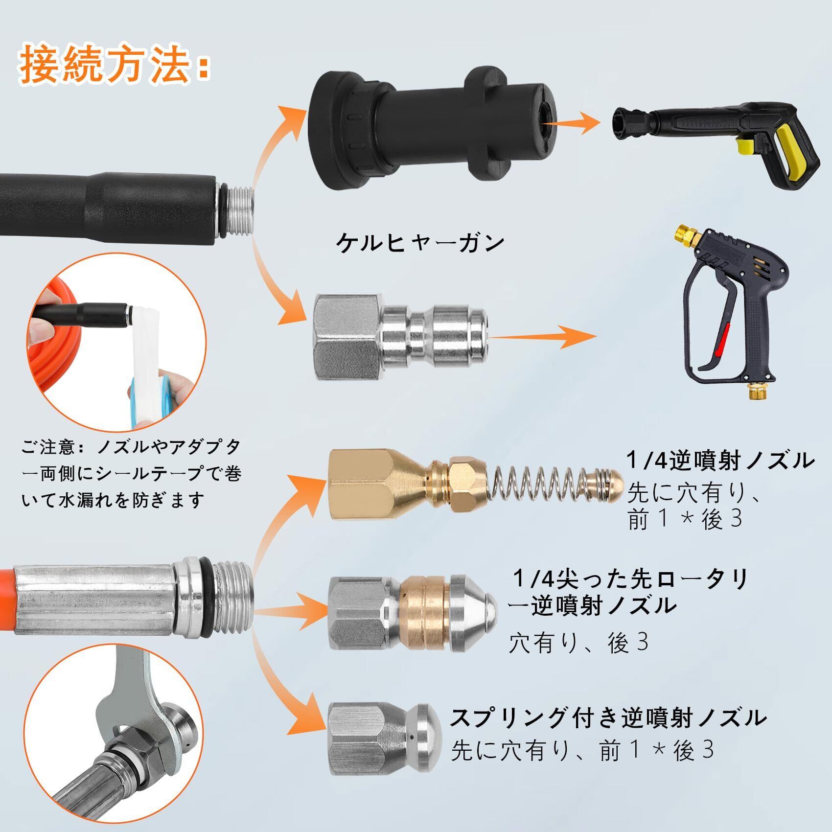 広い範囲&注意する所:ケルヒャー配管洗浄ホースは下水管清掃、台所排水管清掃、自宅 、屋外、オフィスの下水管、排水溝、塩ビパイプ、汚水管、雨どいなどの清掃作業に適しています。ご注意:ご利用する前ぜっひテープを巻いてください。ホースとがんの間やホースとアダプターの水漏れ問題を解決することができます。