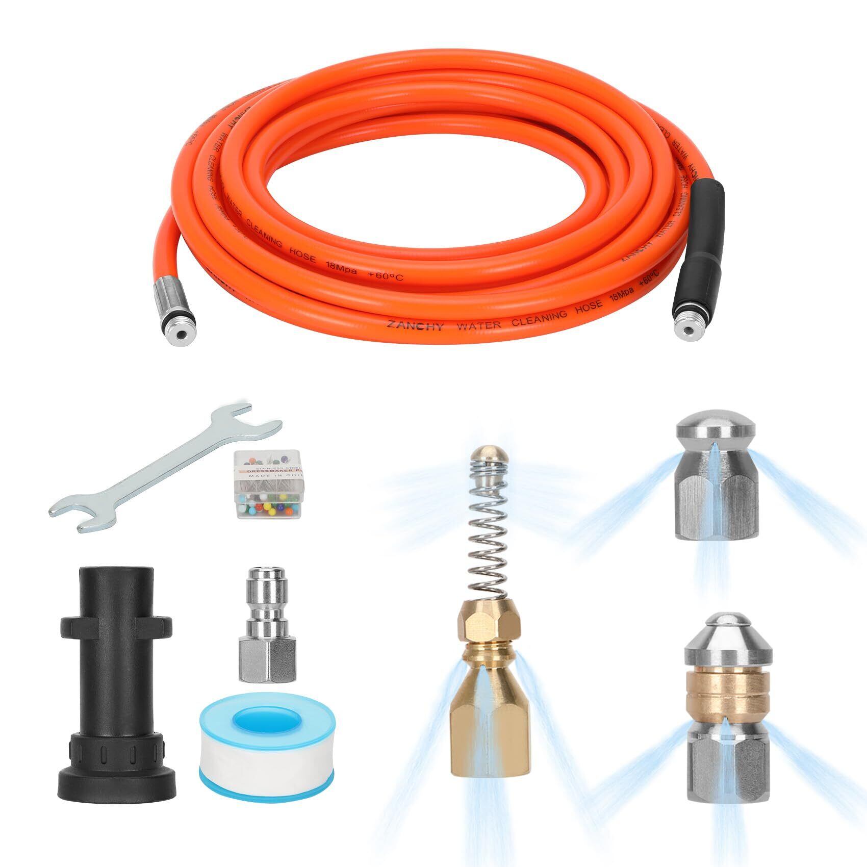 3種類スプレーノズルを持ちパイプクリーニングホース:平やらな形を改善して尖った形で採用した逆噴射ノズルとロータリーノズルは狭いところ、 エルボーの入りをもっと易くなります。スプリング付き逆噴射ノズルには先端スプリングによって、ごみを分解しながら前に進めます。異なる方向の穴から、水を噴射してケルヒャー逆噴射ホースとして利用できます。長年で詰まった塊もどんどん解消します! ご注意:1)詰まりがひどい時、無理に引っ張らず、違う方向から捻りながらゆっくり進めて下さい。2)清掃効果もパイプの直径と関係あります。直径の50㎜以上、カープ内径は70㎜以上のを勧めます。