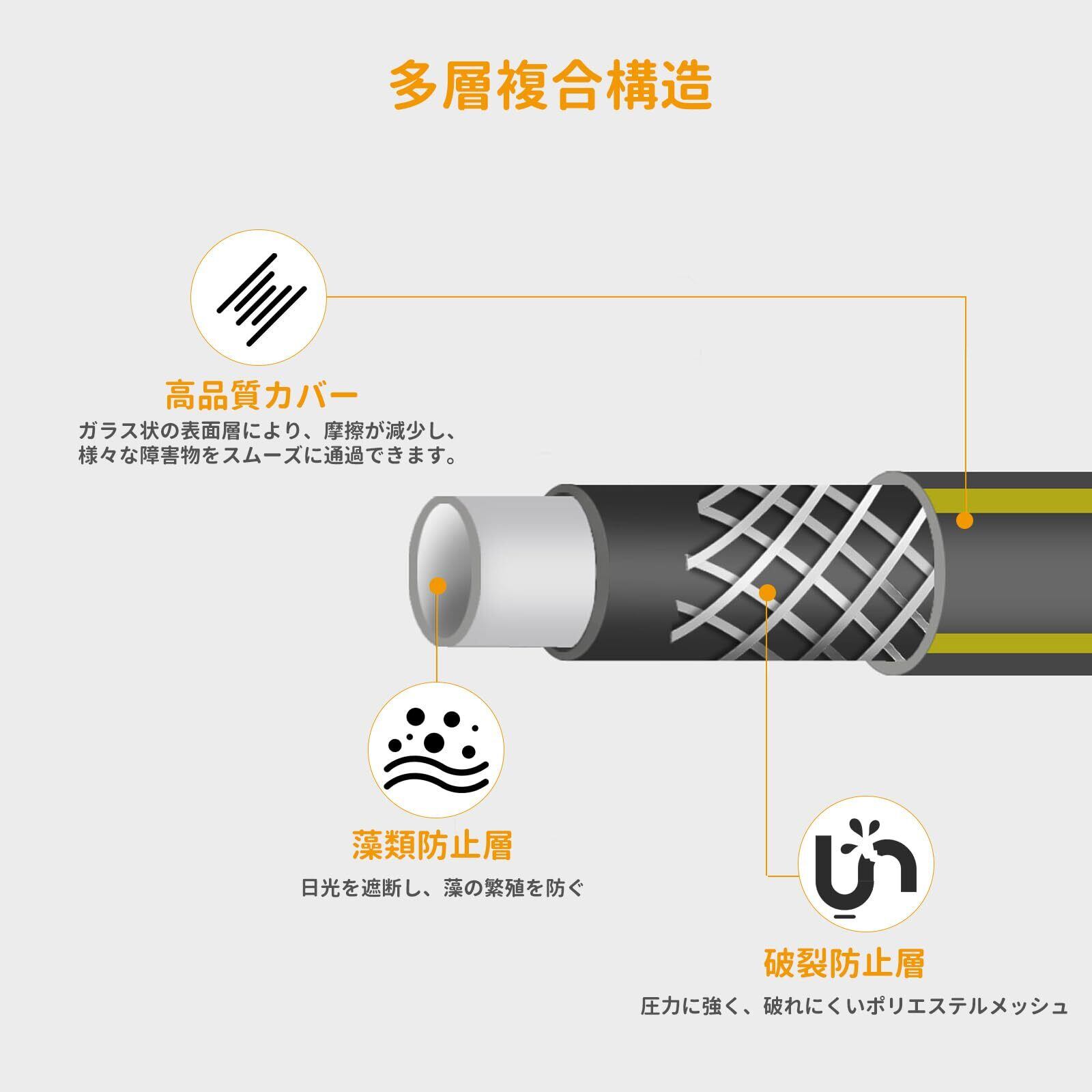 【柔らか】ホースの外層は摩擦抵抗軽減処理が施されています。中層はポリエステル糸が編み込まれているため、耐圧性に優れています。