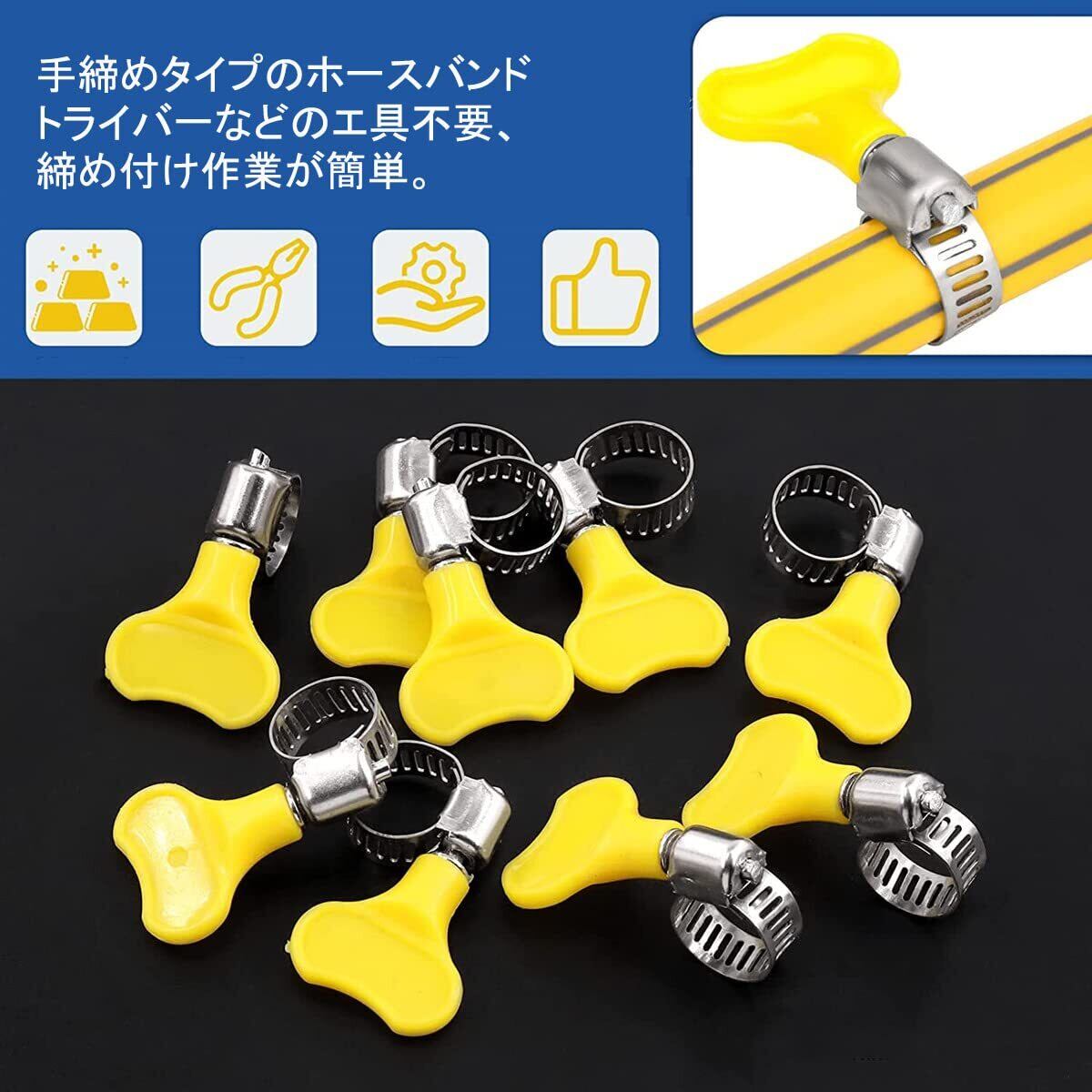 【新着商品】サムコス ホースバンド ステンレス製 散水ホース固定用 工具不要 つまみタイプ 黄色 強力固定 外径:16mm~25mm 作業簡単(8個セット)