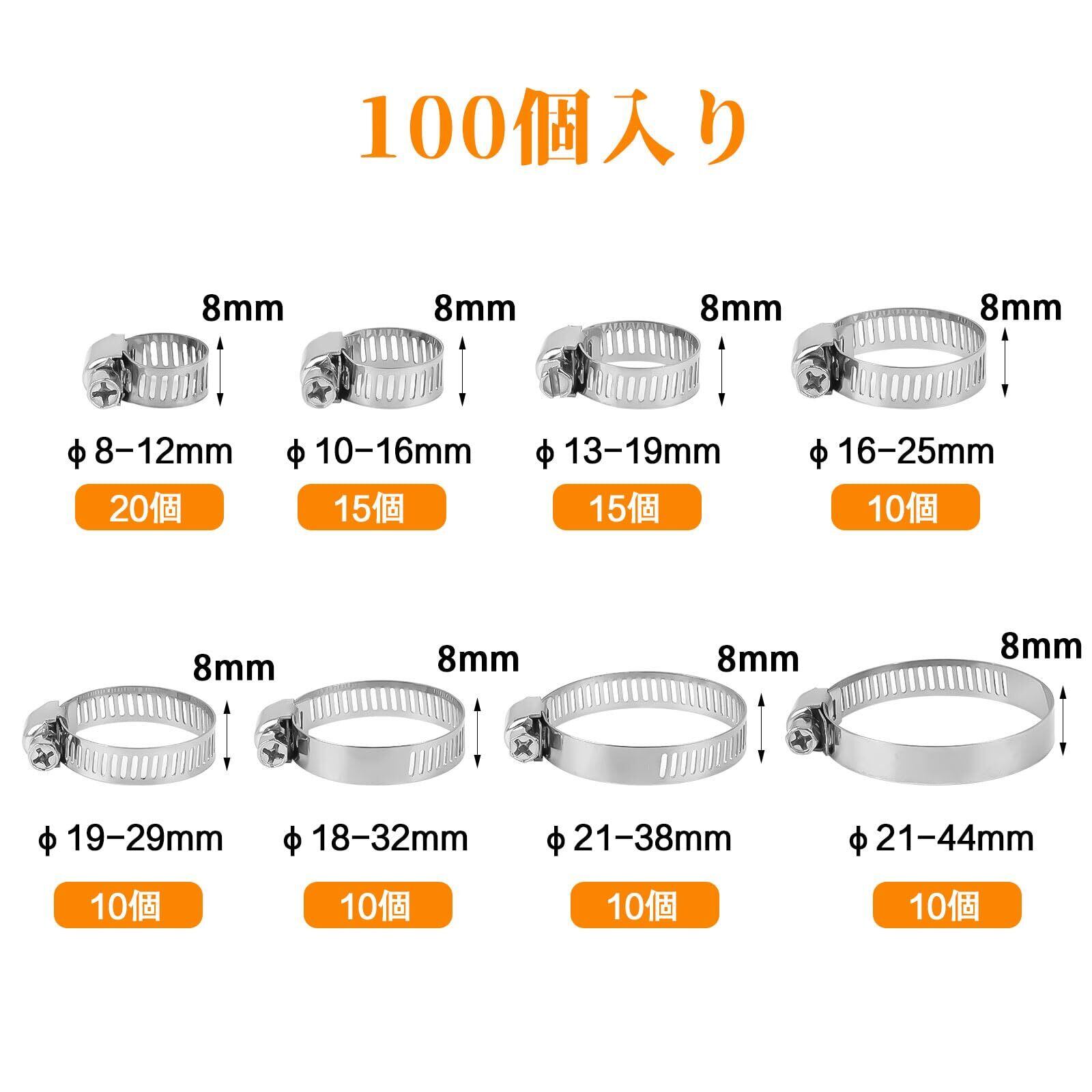 【100個入り 8サイズ】:φ8-12mm(20個)、φ10-16mm(15個)、φ13-19mm(15個)、φ16-25mm(10個)、φ19-29mm(10個)、φ18-32mm(10個)、21-38mm(10個)、21-44mm(10個)、