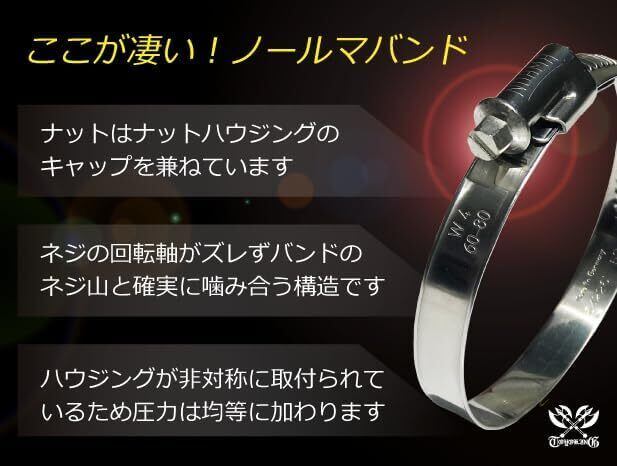 最良のステンレスと言われる「SUS304」を全ての部分に使用、サビ・腐食の全面排除を期待できるホースバンドです。自動車のインタークーラー、ターボ、インテーク、ラジェーターライン等の接続ホースに最適です。自動車はもちろん二輪バイク、船、漁船、重機、建設機械、各種機械等、幅広い用途にご使用頂けます。