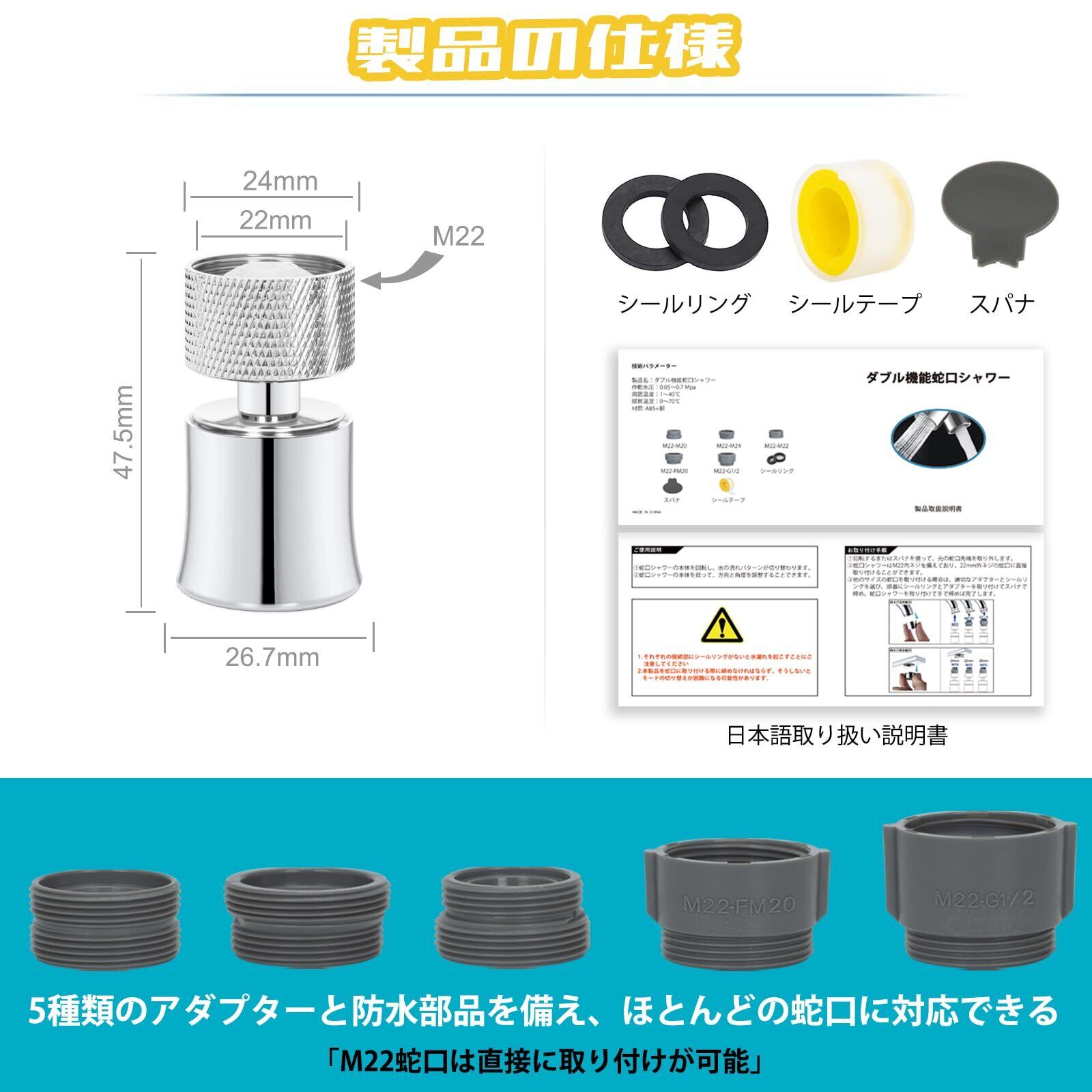 「取付けと取り外しが簡単」5種類のアダプータと防水部品を含んでいて大多数の蛇口に適応して、ローレット滑り止め設計、ツールなしで簡単にフィルターを取り外してフィルター中の雑物を洗うことができます