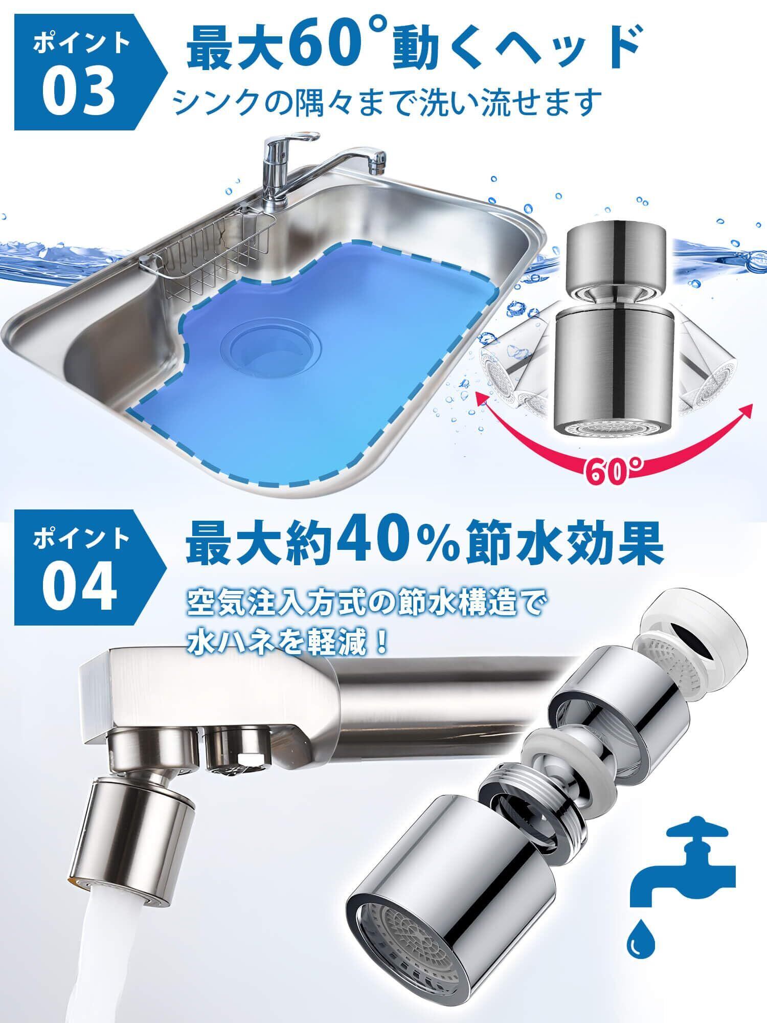 蛇口 シャワー 水道 先端 節水 キッチン蛇口シャワー 60度首振り・360度回転式 泡沫・吐水切替 黄銅製 水はね防止 節水率40% 外ネジ・内ネジ対応 シャワーヘッド キッチン 洗面所 浴室 トイレ 蛇口交換アダプター付 日本語説明書付