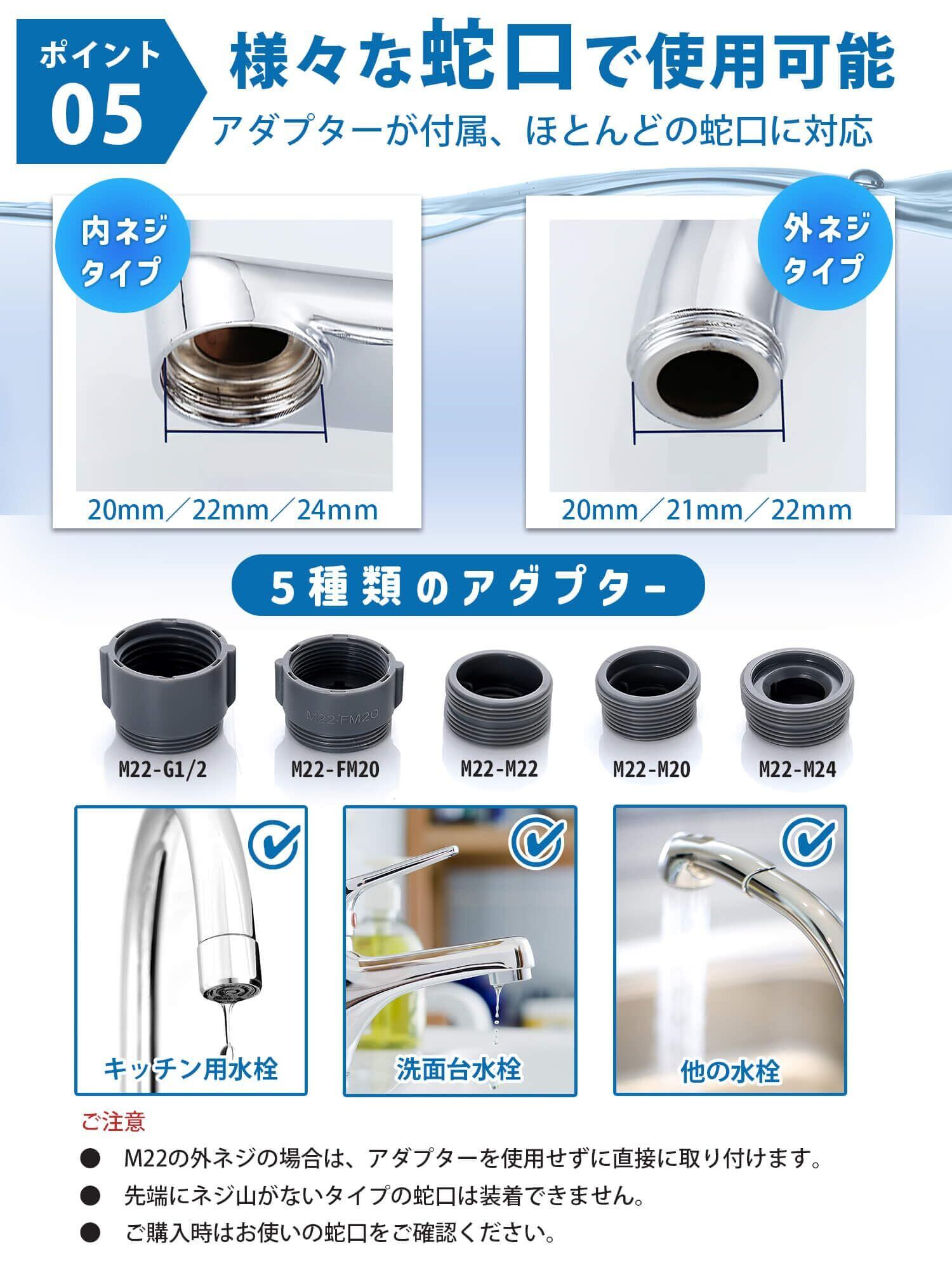 『取付簡単・汎用性高い』蛇口シャワーは取り付けや取り外しが簡単です!蛇口先端がM22の外ネジの場合は、アダプターを使用せずに取り付けます。付属の様々なアダプターを使えば、キッチンだけでなく、台所、浴場、洗面台やお庭の水道の蛇口にもほとんど取り付け可能です。さらに、蛇口シャワーの接続部分には高品質な黄銅素材が使用され、本体には10層のメッキが施されています。これにより、錆びにくく、耐腐食性・耐食性に優れています。※ご購入時はお使いの蛇口をご確認ください。※蛇口先端にネジ山がないタイプの蛇口は装着できません。