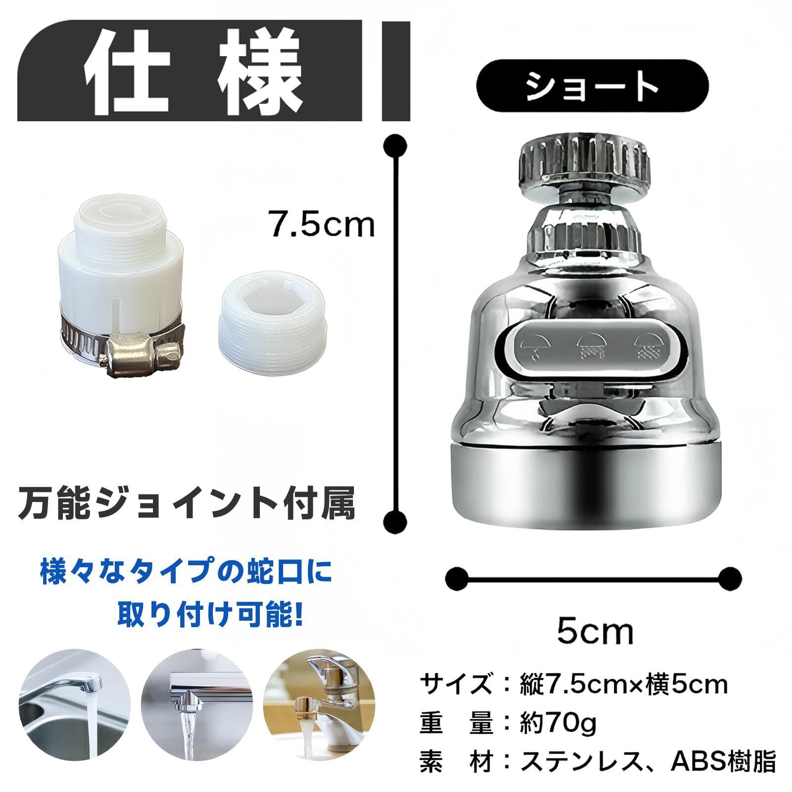 【商品仕様】サイズ:幅約5.1cm *高さ約7.5cm、外ネジ22mm、 内ネジ24mmの蛇口、蛇口にねじ込むだけで、配管工は必要ありません。