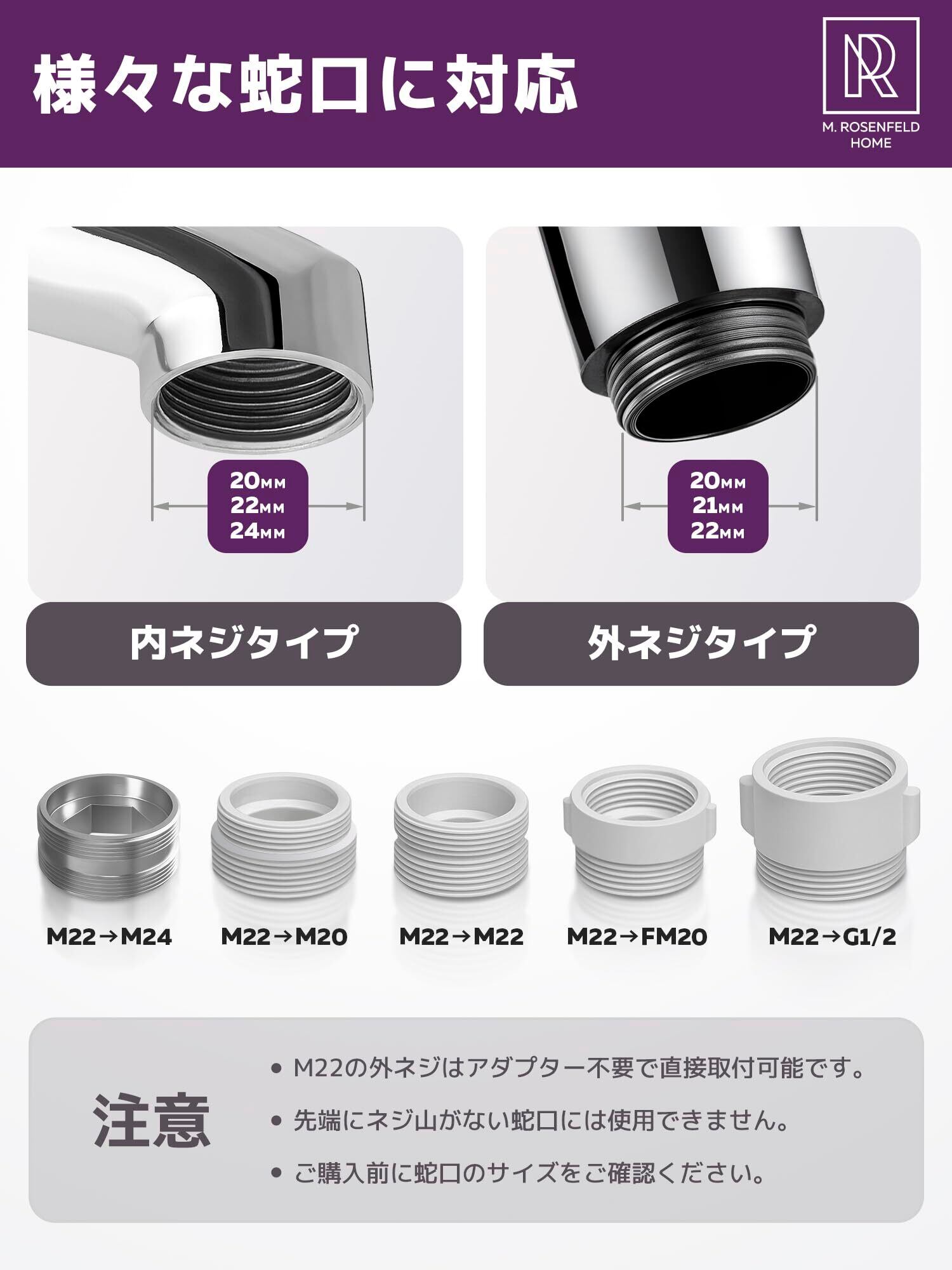 【豊富な付属品で簡単取付】キッチン シャワーヘッド セット内容:本体1個(M22内ネジ)、アダプター5種(M22→M24/M20/M22/FM20/G1/2)、シーリングリング5個、シールテープ1個、取付用レンチ2個、日本語ガイド付。工具不要で初心者でもすぐに取り付け可能。