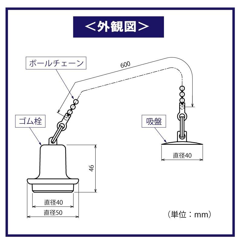 ●このゴム栓は浴槽用ワンプッシュ排水栓(ポップアップ排水栓)が故障した際、浴槽にお湯張りが出来るよう、浴槽排水口を止水するためのゴム栓です。 ●故障した浴槽用ワンプッシュ排水栓(ポップアップ排水栓)の弁フタを外して使用します。(一部のダイヤル式ポップアップ排水栓にも使用できます。) <対応可能な排水口>(※当社調べ) クリナップ、積水ホームテクノ(積水化学工業)、タカラスタンダード、長府製作所、TOTO(東陶機器)、 トクラス(ヤマハ)、日ポリ化工、ハウステック(日立化成)、パナソニック(松下電工、松下電器産業)、 ブレクス(ブリヂストン)、LIXIL(INAX)等 2000年以降の国内販売のユニットバス・システムバス <商品仕様> ゴム栓 材質:EPDM 吸盤(直径40mm)材質:PVC チェーン(長さ600mm)材質:SUS304
