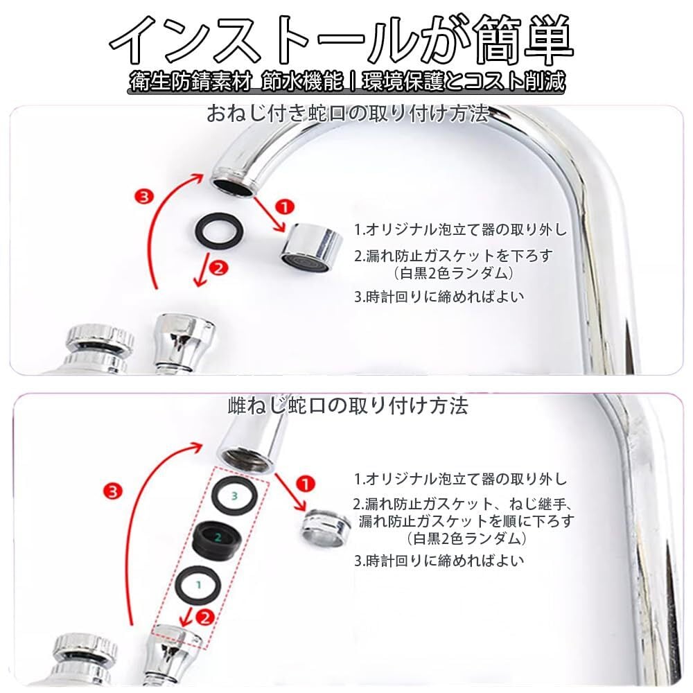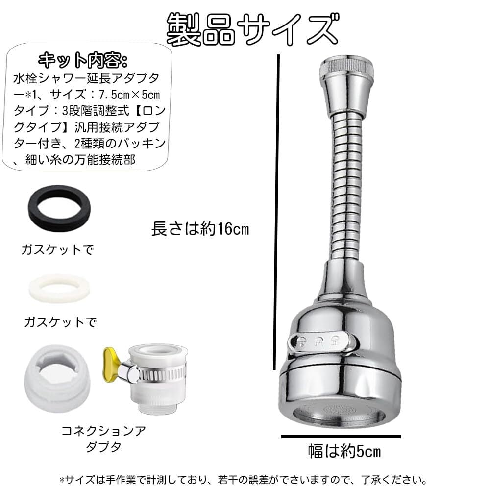 【パッケージ内容】 水栓シャワー延長アダプター*1、サイズ:7.5cm×5cm、タイプ:3段階調整式【ショートタイプ】变体【ロングタイプ】 汎用接続アダプター付き、2種類のパッキン、細い糸の万能接続部 【3モード切替|洗い物の効率アップ】 ▼ 集中水流:頑固な汚れに ▼ シャワー水流:野菜の優しい洗浄 ▼ ミスト水流:洗剤の泡立て → ワンタッチで水流を切り替え、洗い物時間を30%短縮 【キッチン対応|確実な取り付け】 22-28mmの蛇口径に対応(日本標準サイズ)。ステンレス製アダプターがゆるみ防止設計で水漏れなし。女性でも工具不要で10秒設置可能。 【180°スマート可動|狭いシンク対策】 従来品よりコンパクトな7.5cm設計。180°制限付き回転で: ▼ 壁際蛇口でも衝突防止 ▼ 角度固定機能付き → 日本の小型シンクに最適化 【衛生的なサビ防止素材 節水機能|環境と家計に優しく】 グレードステンレス採用。塩素消毒水道水に強く、錆・白濁なし。毎日の使用でも5年間の耐久付き。シャワーモードで水流拡散率40%向上。洗い物時の水跳ねを抑えつつ、水道代を平均15%削減(メーカー試験値)。