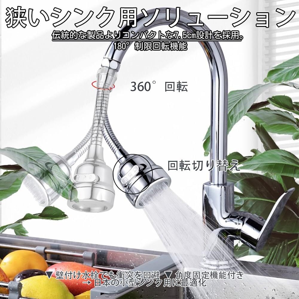 【180°スマート可動|狭いシンク対策】 従来品よりコンパクトな7.5cm設計。180°制限付き回転で: ▼ 壁際蛇口でも衝突防止 ▼ 角度固定機能付き → 日本の小型シンクに最適化