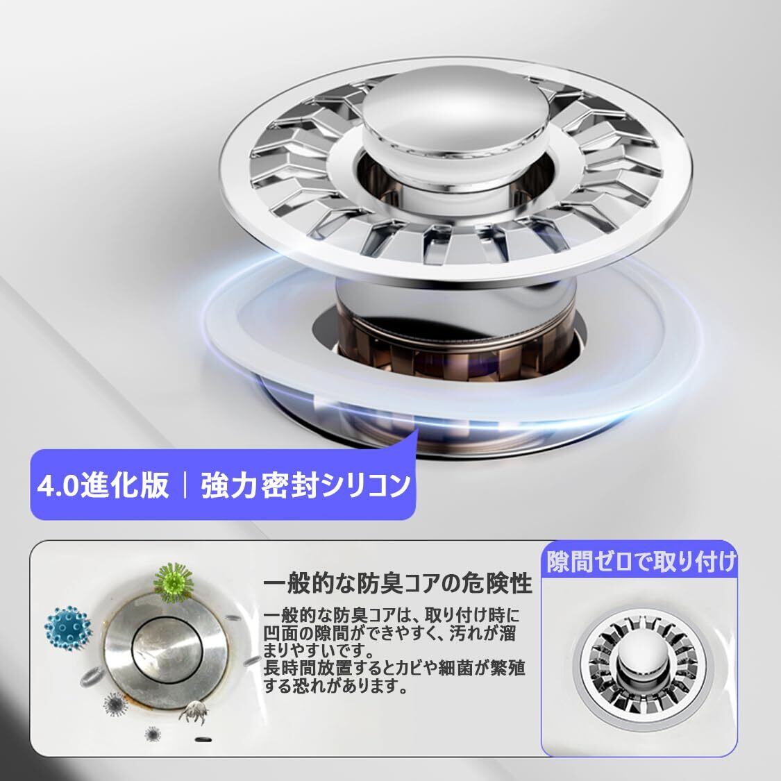 【ワンクリックで素早く排水】弾丸型コアデザインで反発力が強く、ワンプッシュで素早く密封・排水が可能。便利でスピーディー。さらに厚みのある段差付きシリコンガスケットにより、下水の臭いを防ぎ、家の中を清潔な空気に保ちます。