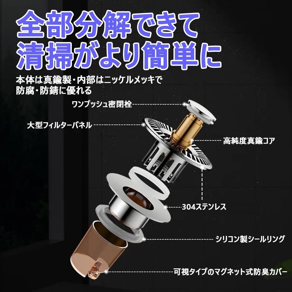 特徴 ポップアップ, 取り外し可能, 目詰まり防止, 耐錆性, 防臭