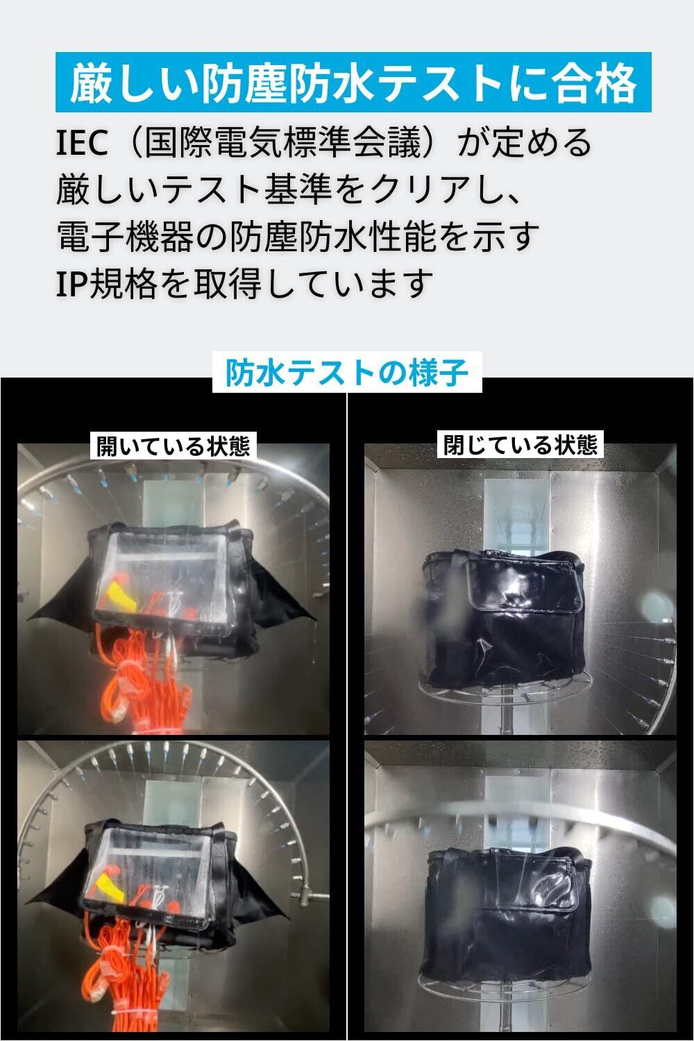 厳しい防塵防水テストに合格:IP54を取得。世界各国で採用されているIEC(国際電気標準会議)が定める電子機器の防塵防水性能を示すIP規格を取得しており、300〜500mmの距離で360°全方向から10ℓ/分の放水を10分間を受けたとしても、内部のポータブル電源の動作に影響を及ぼさないという厳しい基準をクリアしています。 マジックテープを全て閉じた状態で防塵防水バッグを装着すれば、「キャンプ中の急な雨」や「保管中に発生するほこり」から安心してポータブル電源を保護することができます。