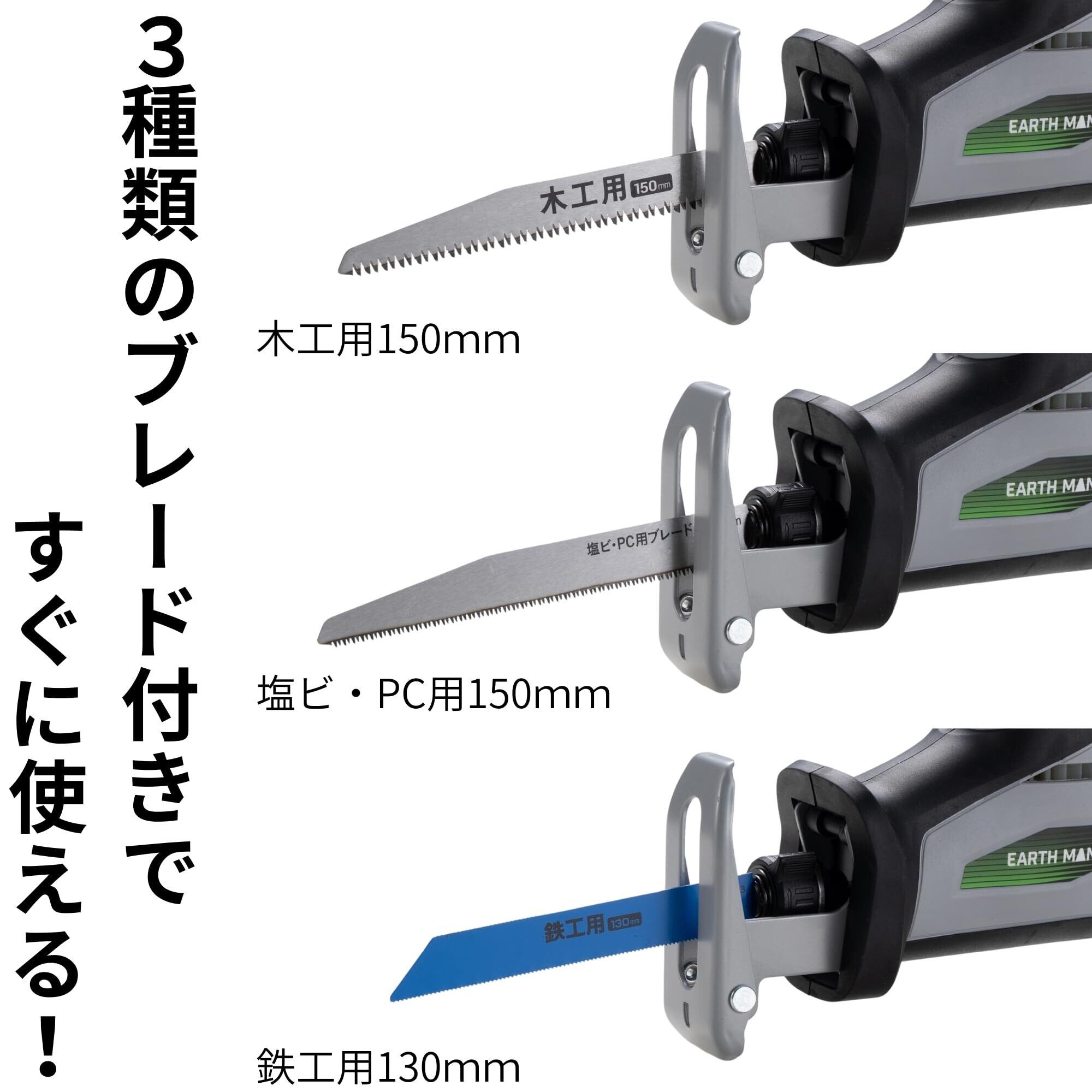 【セット内容】電気のこぎり本体×1、木工用ブレード×1、塩ビ・PC用ブレード×1、鉄工用ブレード×1、取扱説明書×1