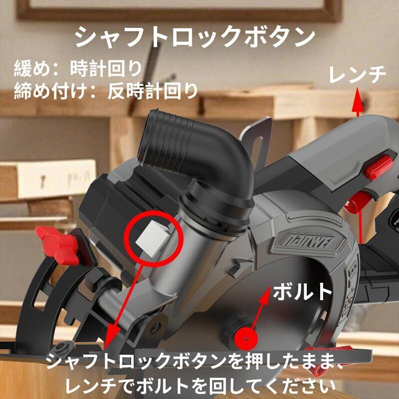【ダスト排出口・作業環境をクリーンに保つ】この丸鋸充電式は粉塵対策として360°回転可能なダスト排出口を装備。集塵機(別売)に接続すれば、切断時に発生する木粉やチップを効率的に吸引し、作業スペースを清潔に保てます。排出口の角度は自由に調整可能なので、作業姿勢に合わせて最適な位置に設定可能。※注意:集塵機接続用のアダプターは付属していません。