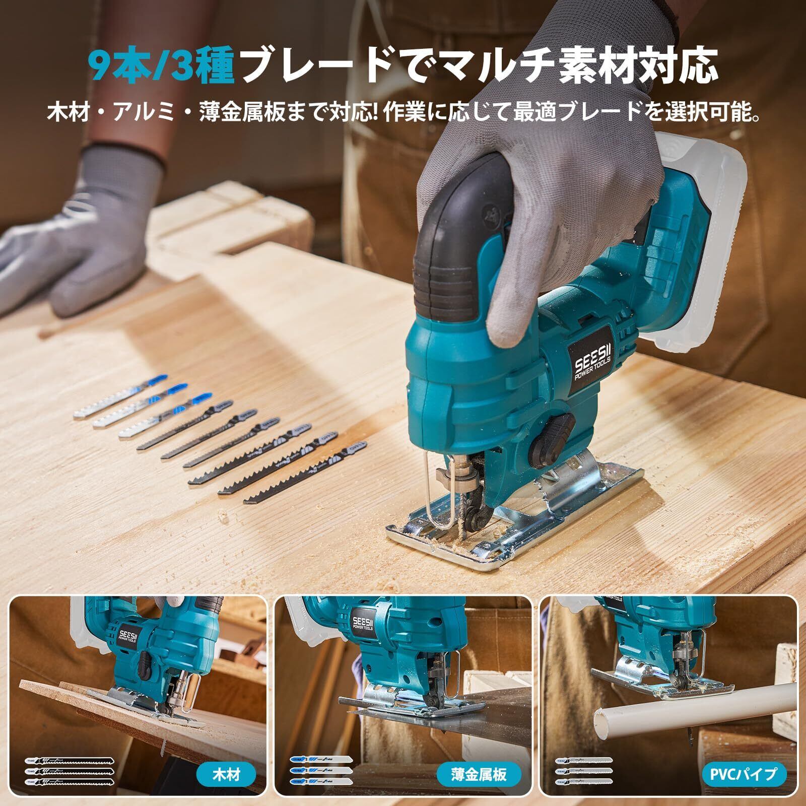 【コードレス設計&バッテリー互換性】本製品は本体のみ(バッテリー・充電器別売)となっており、SEESIIおよびマキタ18Vリチウムイオンバッテリー(BL1820B/BL1830B/BL1840B/BL1850B)に対応。付属品:ジグソー本体、3種9本ブレード、収納バッグ、日本語取扱説明書。コードレス設計により、場所を選ばず、コードの取り回しや断線の心配もありません。
