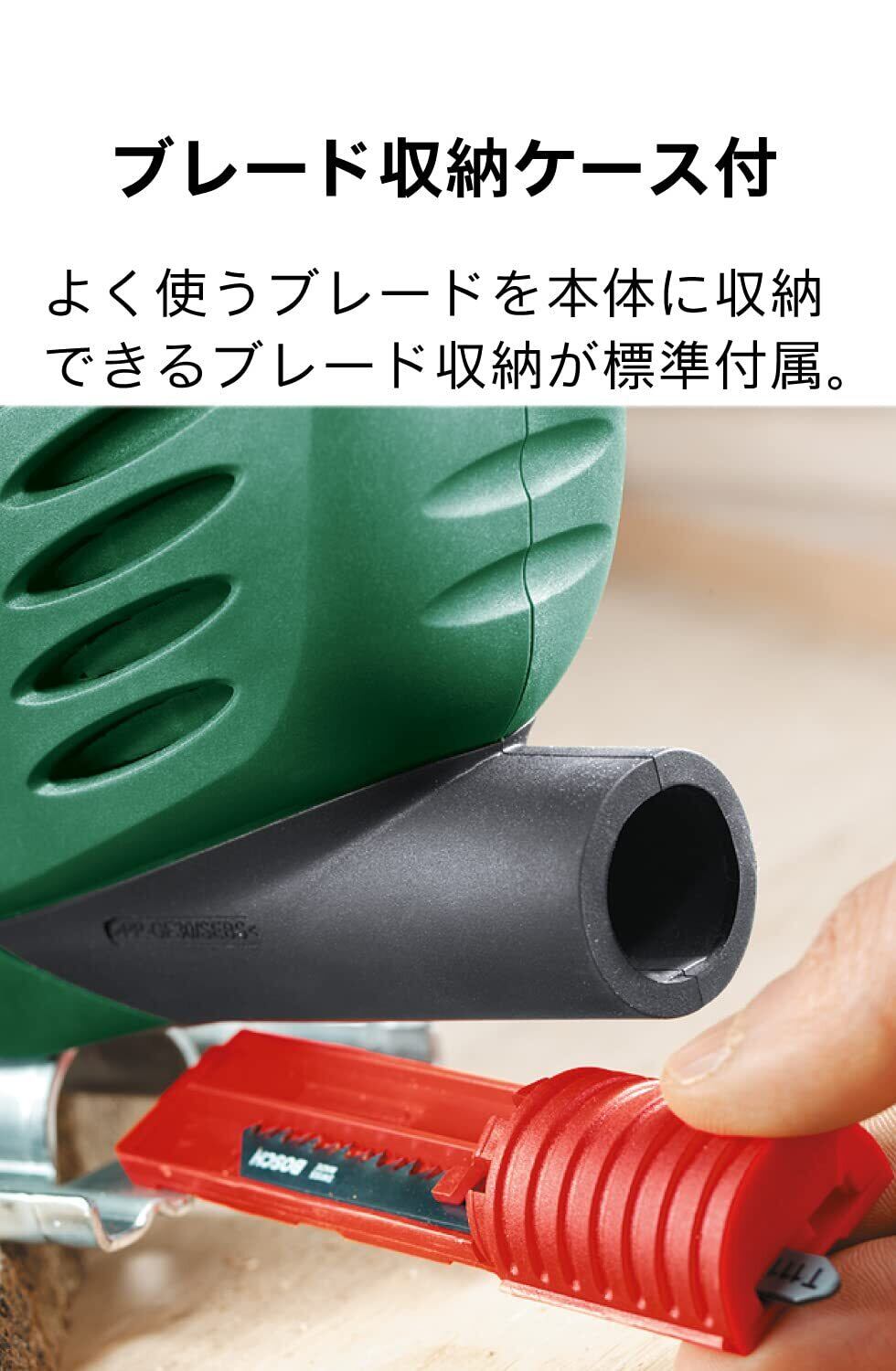 ●パワフルな530Wモーター搭載ながら、バランサー機構により低振動を実現しました。●薄い材料から繊細な切断まで安定した切断作業が可能です。●軽量・コンパクトに加えて、より正確な直線切断をサポートする切断線ガイドを標準装備するなど、従来機より使いやすさがさらに向上しました。●ブレード(刃)の動きにしゃくり運動を加えるオービタル機能は4段階です。●けがき線をクリアに保つブロア機能付きです。●よく使うブレートを本体に収納できるブレード収納ケース付きです。●木材 金属の切断に。