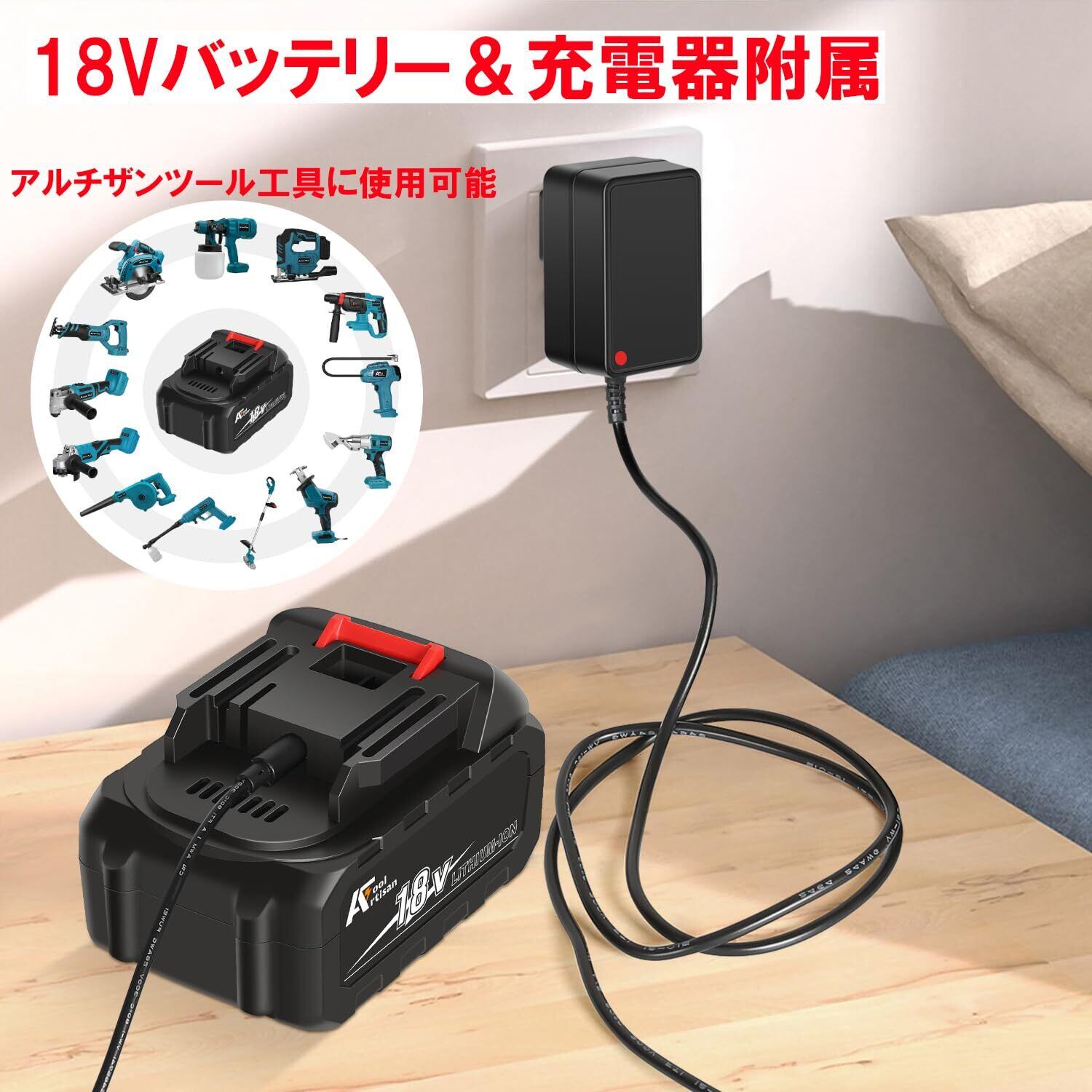 附属のバッテリーはアルチザンツールオリジナル充電式工具向けに製造されたバッテリーとなり、アルチザンツール充電式工具すべてにお使い頂けます。3.0Ahの大容量で電動工具が連続稼働できます。工具の消費電力や使用状況によりますが作業できる時間は約40分~60分程度です。尚マキタ純正18V工具及びマキタ18V互換工具も使用可能ですが一部使用出来ない工具(掃除機、草刈り機など)もあります。※草刈り機等の大電流を扱う製品は規格値に到達しない可能性があります。充電時間:0%-100%→約6時間