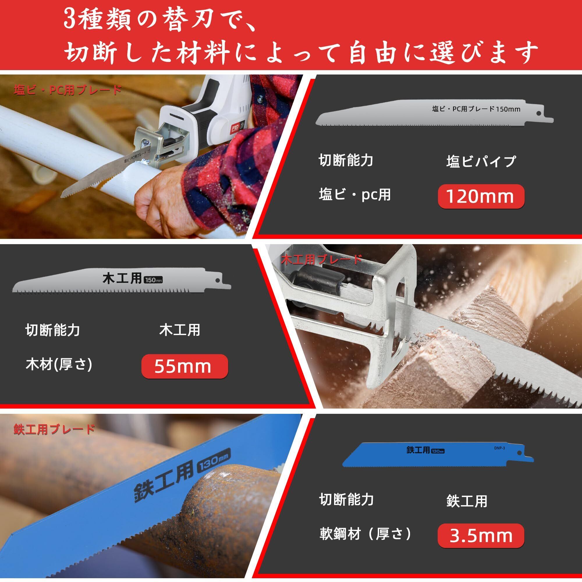 各種アクセサリー:付属品が非常に多いので、それぞれに往復鋸本体、2.0Ahリチウムイオン電池x 2、スペア刃x 3(木工1本、金属1本、PVCパイプ1本)、六角レンチ、充電器、収納袋が含まれています。日本語の取扱説明書も含まれています。何かご質問がございましたら、いつでもうちの店までご連絡ください