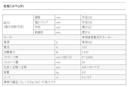 切断能力(mm):鋼管外径130・塩ビパイプ外径130・木材厚さ120・軟鋼材厚さ19