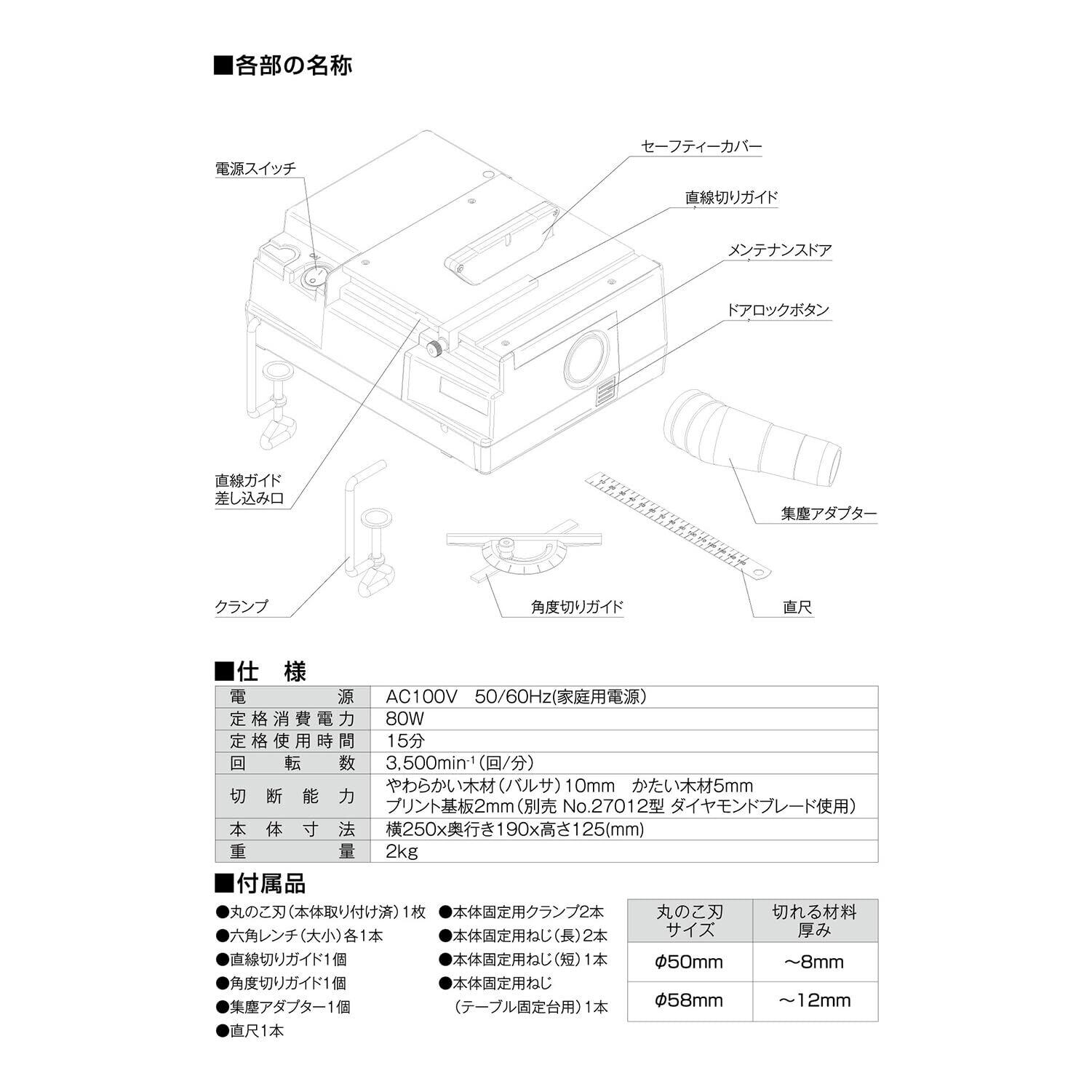 付属品:丸鋸刃荒目58mm・本体固定クランプ2個・直線ガイド・角度ガイド