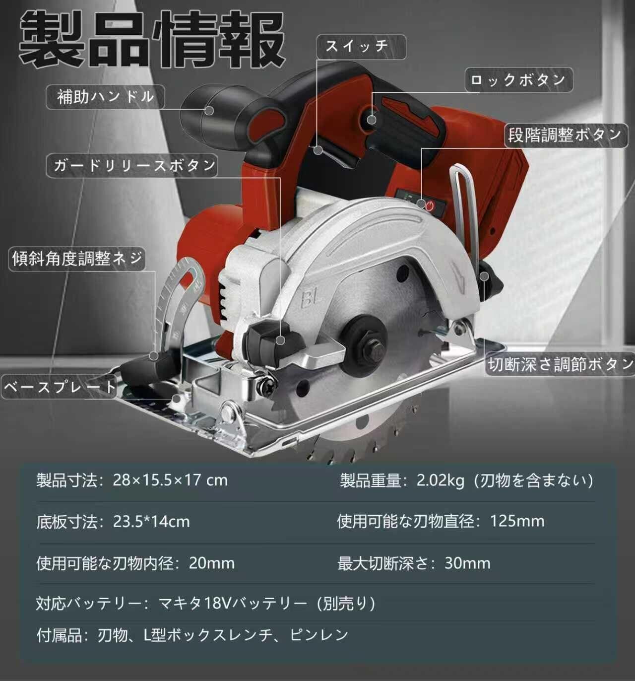 【数量限定】丸のこ 充電式丸鋸 コードレス 刃外径125mm/100mm対応 軽量 高精度 マキタ18Vバッテリー対応本体のみ(バッテリー・充電器別売)DIY用 1年メーカー-RA