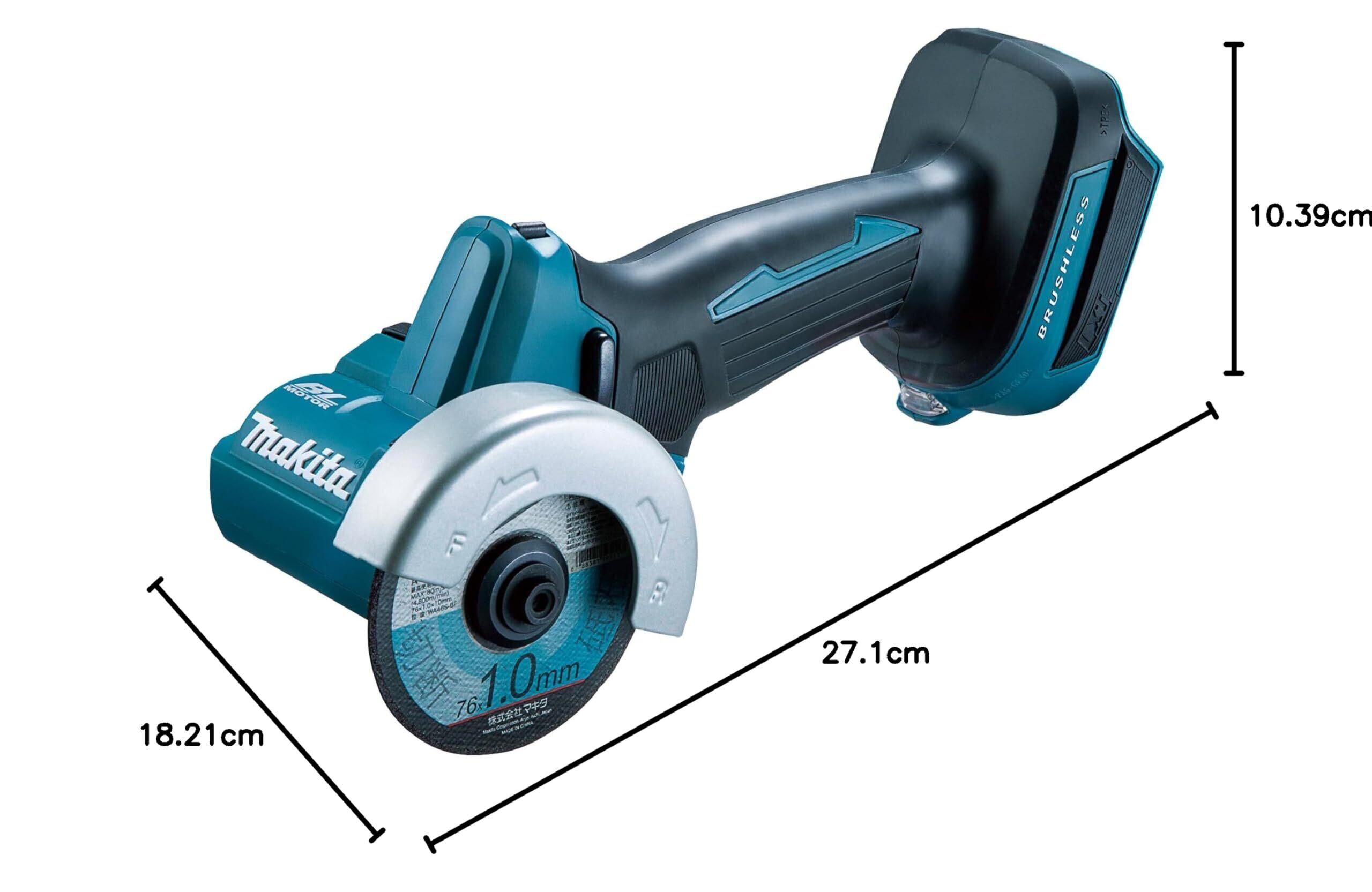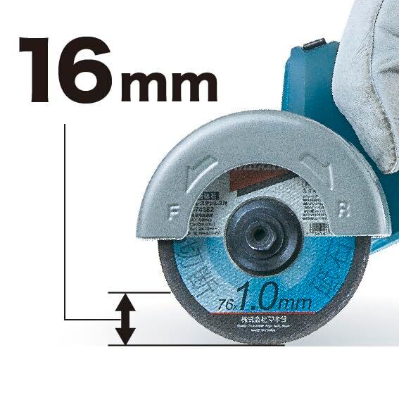 直流18V、スライド式Li-ionバッテリ仕様。バッテリ・充電器別売。刃物外径:76mm/内径:10mm。最大切込深さ:90°時・16mm。回転数:20,000[回転/分]。1充電作業量(BL1860B装着時、目安)金工切断:約283本(M10全ネジ切断)、石工切断:約23m(タイル300×5.5mm)※金工切断は切断砥石(A-74382)、石工切断はダイヤモンドホイール(A-74398)使用時。
