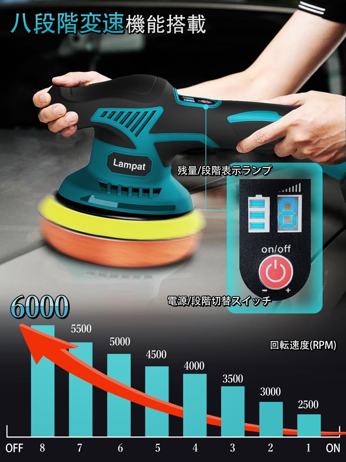 【8段階変速機能搭載&幅広い作業場面】Lampat電動ポリッシャーは6000rpm~2500rpmの8段階変速機能搭載、必要に応じて適切な速度を設定できます。電動ポリッシャーの電源スイッチを長押しすれば起動し、一回押すごとに速度が1段階上がります。車の研磨、ワックスがけ、艶出し、鏡面磨き、金属の塗装はがしと錆落し、木材の研磨、風呂場の掃除、大理石などの磨きに使え、物の光沢を復元し、多様作業シーンです。