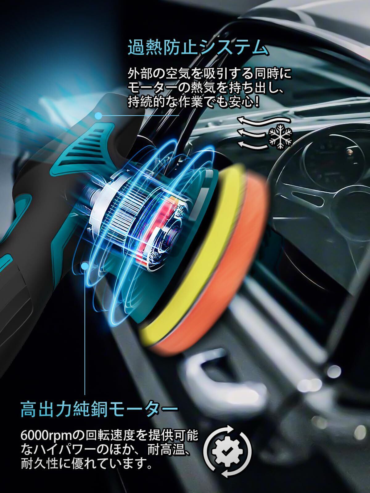 【高品質純銅モーター&過熱防止機能】Lampatコードレスポリッシャーは高性能な純銅モーターを採用し、1分間に最大6000次の回転スピードを提供可能、強力な動力による作業効率の向上のほか、研削時の安定性にも優れております。コードレスポリッシャーの両側に設けられた通風口は良好な放熱性能を実現し、モーターが長時間稼働した熱風を持ち出すことで、過熱の心配なく使用時間と耐久性を延長しました。