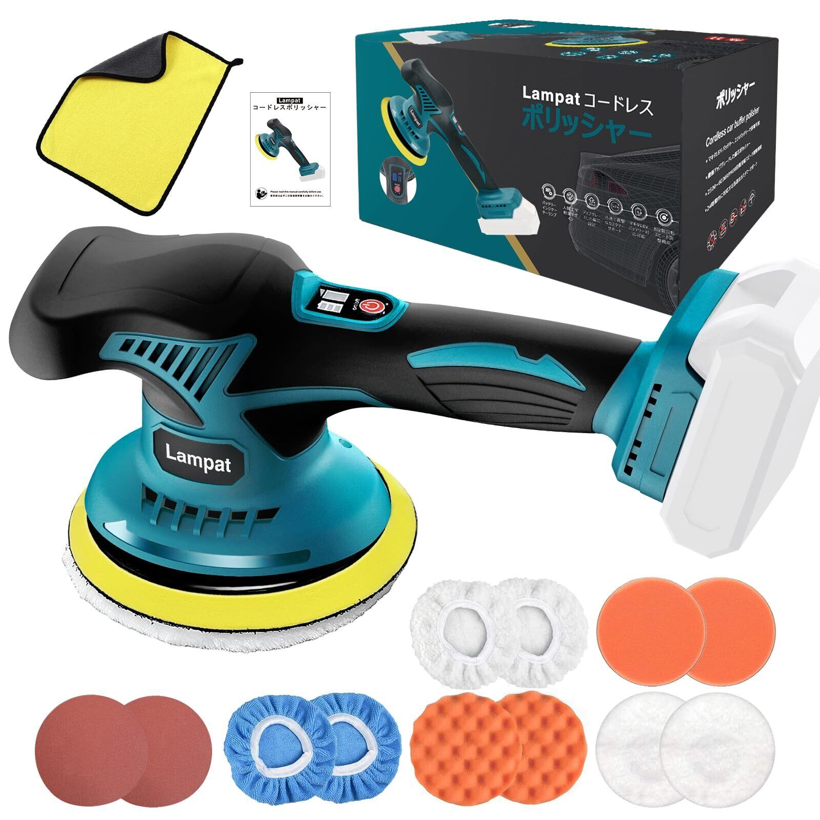 Lampat ポリッシャー 車 ダブルアクション マキタ18Vリチウムバッテリー対応可能 コードレス 電動ポリッシャー 充電式 8段階変速 150mm裏板 6000-2500RPM 強力モーター 過熱防止機能 バッテリー残量表示 偏心構造 ワックス掛け 艶出し 車磨き 鏡面磨き 錆落し ランダムオービットサンダ 家庭用 研磨機【本体のみ・電池と充電器別売】 日本語取扱説明書