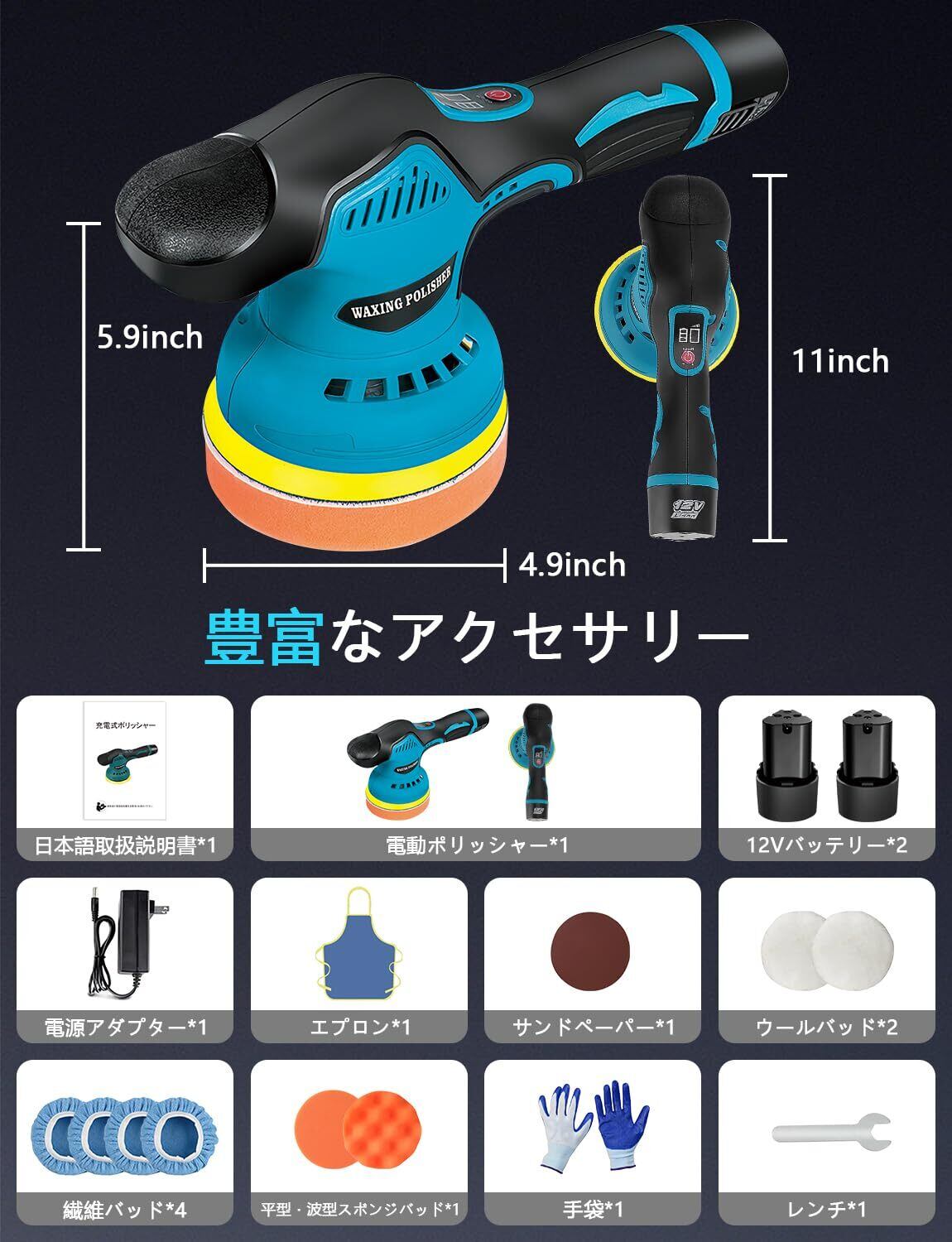 充実の付属品:充電式ポリッシャー本体、12V 1.5Ahリチウムイオンバッテリー2個、充電アダプター、エプロン、手袋、波型スポンジパッド、平型スポンジパッド、サンドペーパー、ウールパッド2枚、タオルカバー4個、日本語取扱説明書が含まれています。市販のΦ125 ~ Φ150 mmの研磨パッドに対応しています。不具合があれば、無料で交換いたしますので、安心してご購入ください。