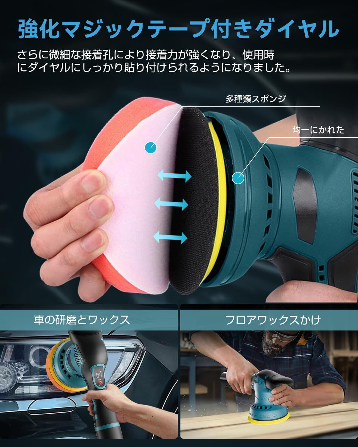 【問い合わせ·包装リスト】このたび電動ポリッシャーをお買上げいただきましてありがとうございます。お問い合わせ方法:「注文履歴」→「該当の注文を選択し商品ページに移動する」→「販売元」→「質問する」。お問い合わせには、24時間以内に返信致します。包装リスト:本体 * 1;マジックテープダイヤル * 1;バッテリー * 2;充電器 * 1;紙やすり * 1;平面スポンジパッド * 1;波のスポンジパッド* 1;タオル地パッドカバー * 1;毛バフパッドカバー * 2;ブルータオル地パッドカバー * 2;専用レンチ * 1;取扱説明書 *1 。ポリッシャーの豊富な付属品は、様々な場面と異なる材質の表面を研磨することができます、ワックス、金属のペンキと錆、木材の研磨、浴室の清潔、大理石の研磨などの用途は品物の元の光沢を回復します。