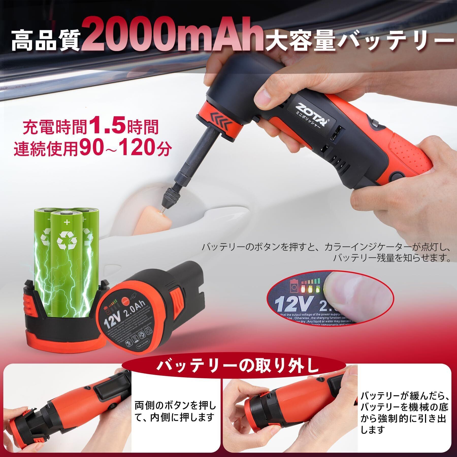 【豊富な付属品】ZOTA電動ポリッシャー 付属品が豊富で充実しており、充電器+12Vバッテリー2個+各種ポリッシングパッド+交換用パーツが同梱。フルセット装備と日本語取扱説明書付きで、開封後すぐに使用可能。専用収納ケース付きで携帯に便利。