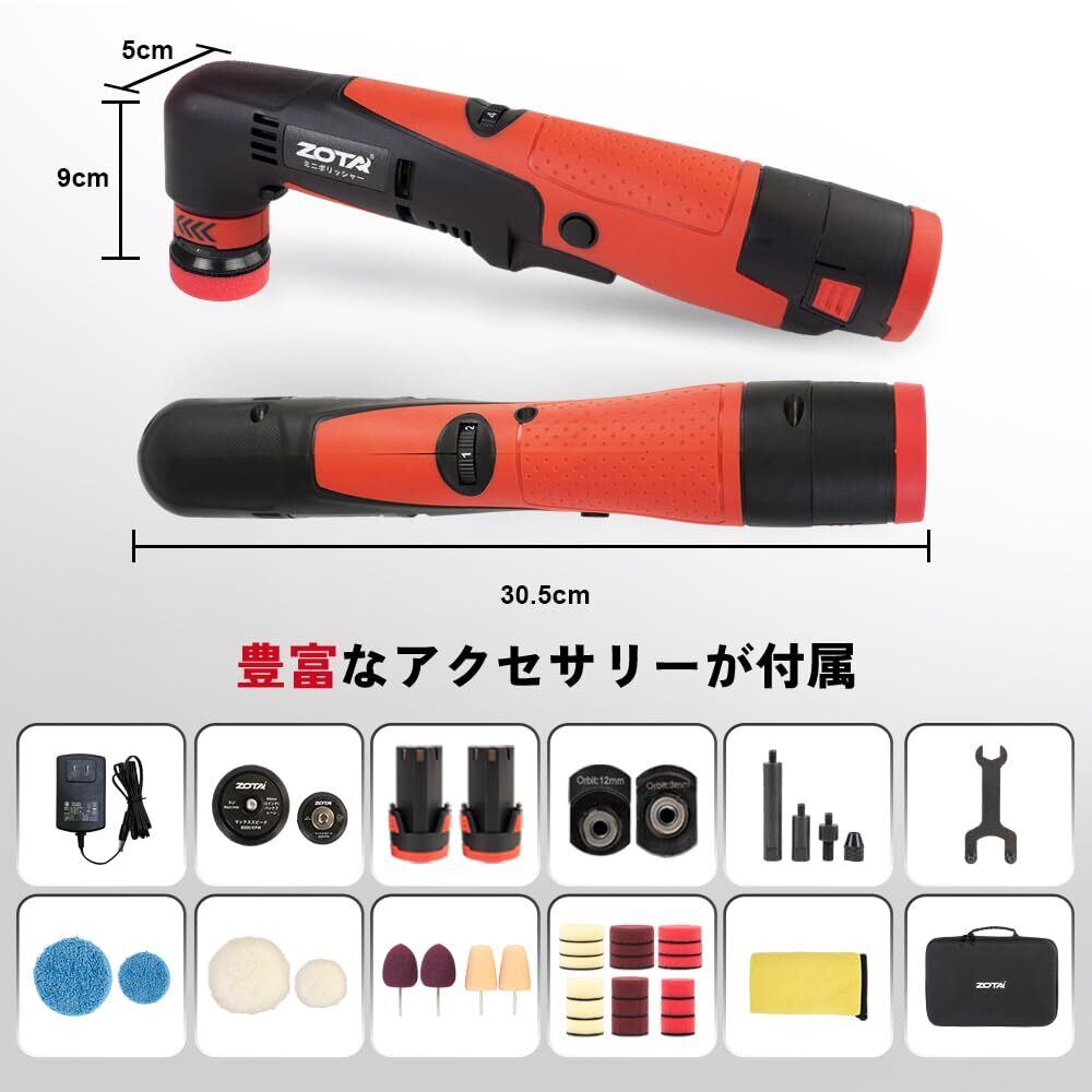【数量限定】ZOTA ミニポリッシャー,30mm/50mmダブルアクション ポリッシャー コードレス 2800~4500rpm 六段階スピード調整 ダブルアクション/シングル切替 12V 2.0Ahバッテリー2個付属 PSE認証 充電式 収納バック付き ヘッドライト復元/ワックスがけ/バイクケア対応 (DP2A)