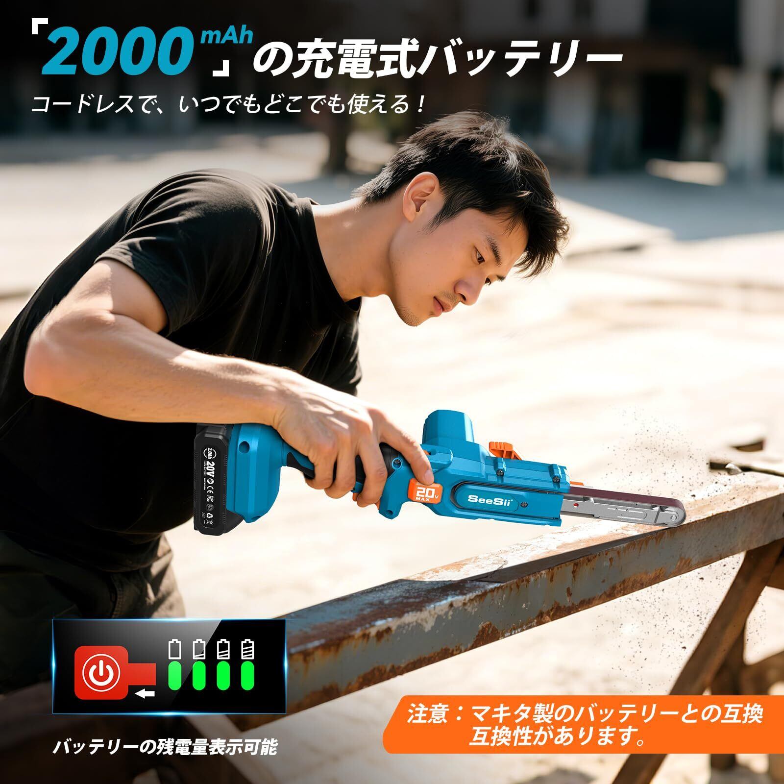 SEESII 電動サンダー 充電式サンダー ベルト 13mm 9枚研磨ベルトサンドペーハ 6段階調速 大容量充電式バッテリー付き マキタ18vバッテリー対応 日本語取扱説明書