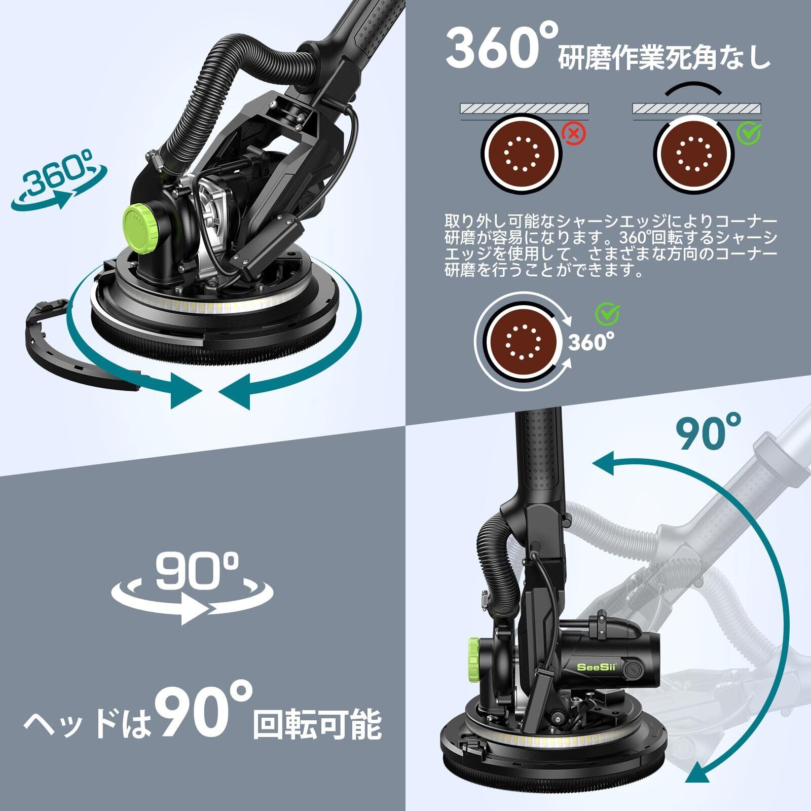 【研磨作業360°死角なし】取り外し可能なエッジデザインにより、電気ドライウォールサンダーが隅々まで容易に研磨可能です。壁際などの狭い場所でも効率的に研磨できます。さらに、ヘッドは90度回転可能で、研磨角度の調整が便利です。傾斜のある天井や凹凸の表面でも楽に平らに研磨できます。