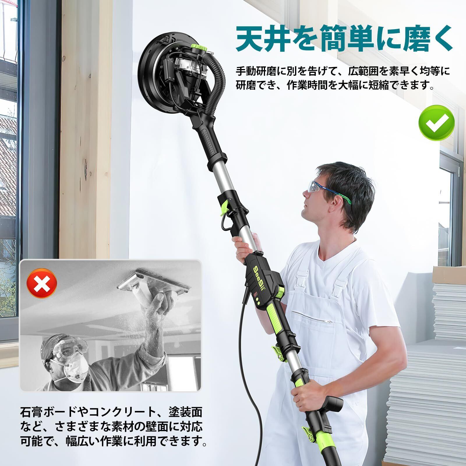 【2025最新改良】SEESII 電気ドライウォールサンダー 1200W ポールサンダー 伸縮式ポール 210cm調節可能 6段変速 2400 RPM LEDライト付き 自動集塵システム ロングダストホース 集塵袋 6枚のサンドペーパー 2枚の無塵サンドペーパー 天井や壁面の作業に最適