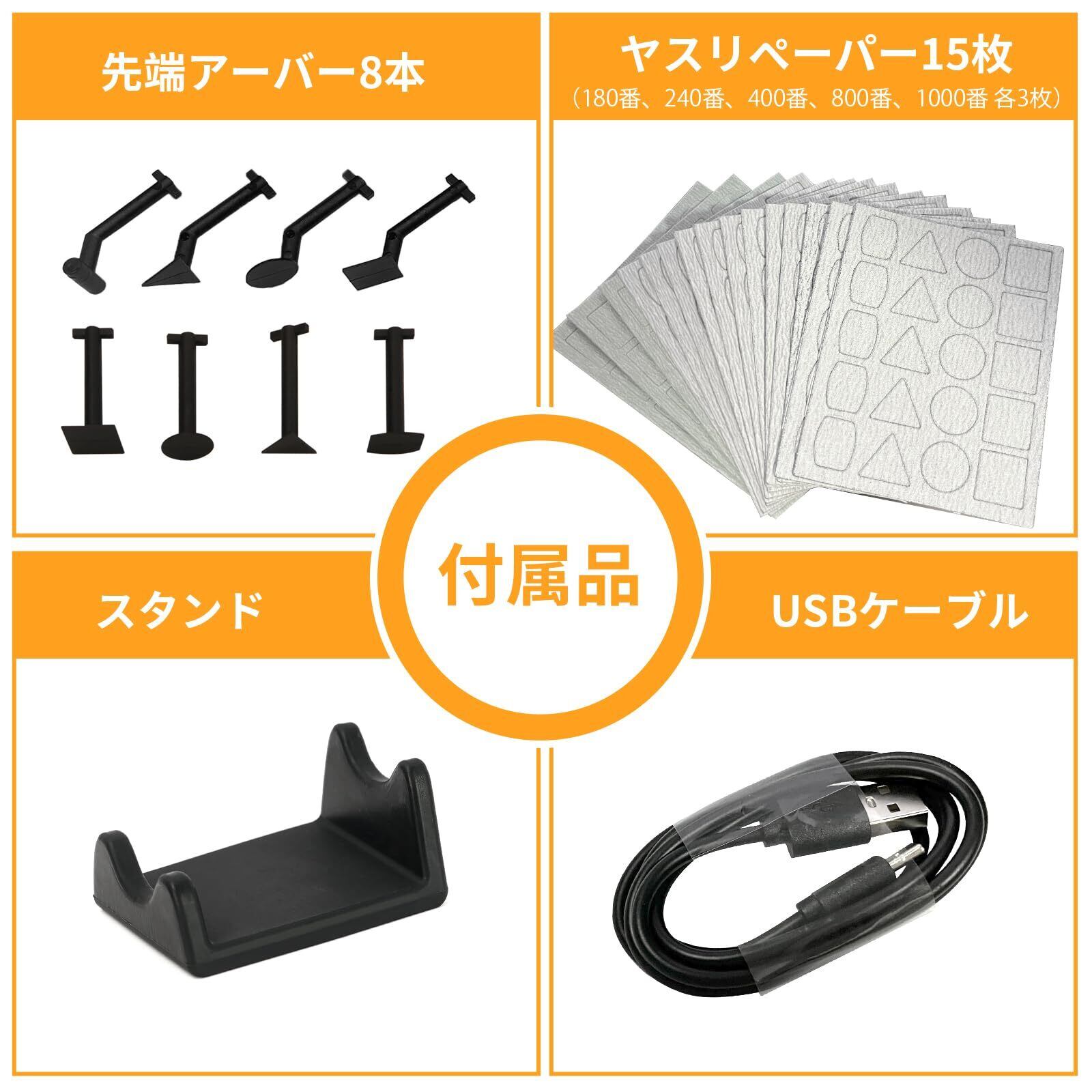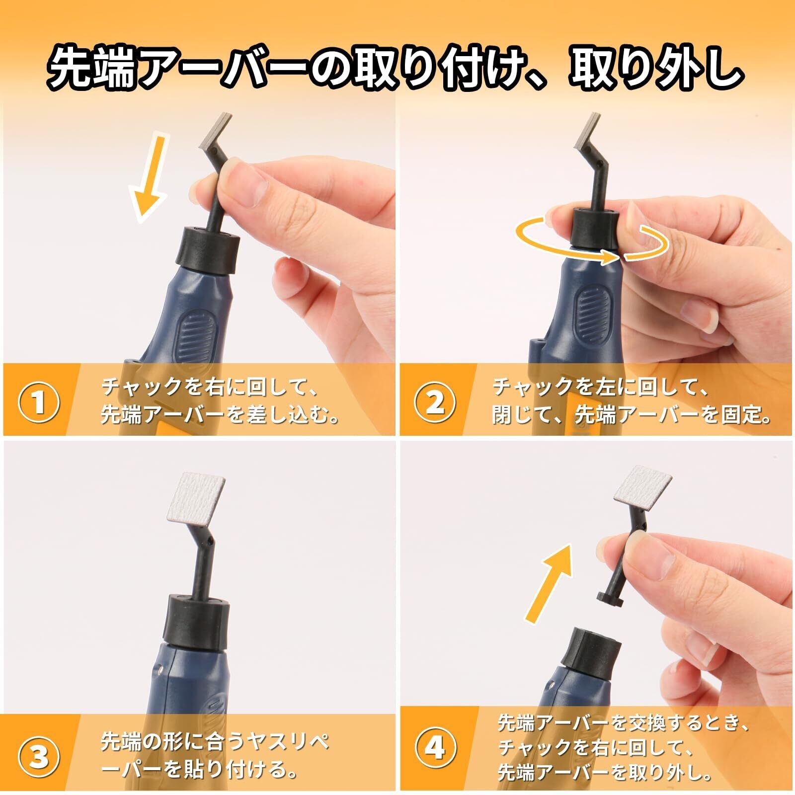 【ヤスリペーパー5種&先端アーバー8種】通常のセットの180番・240番・400番に加え、800番と1000番のヤスリペーパーを付属しました。さらに細かい仕上げ作業が可能に。ワンタッチで取り替えられる先端アーバーは8種類。面で当てやすいストレートタイプと角度がつけやすい曲がりタイプ。研磨する場所によって先端アーバーの形状を取り替えることができます。ヤスリペーパーは1シートに先端アーバーに合わせて4種類の形状が各3枚。裏面はシールになっているので先端アーバーにそのまま貼り付けできます。
