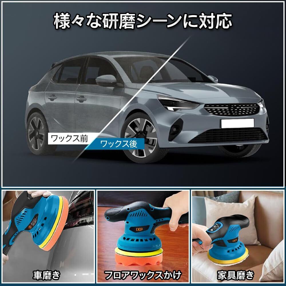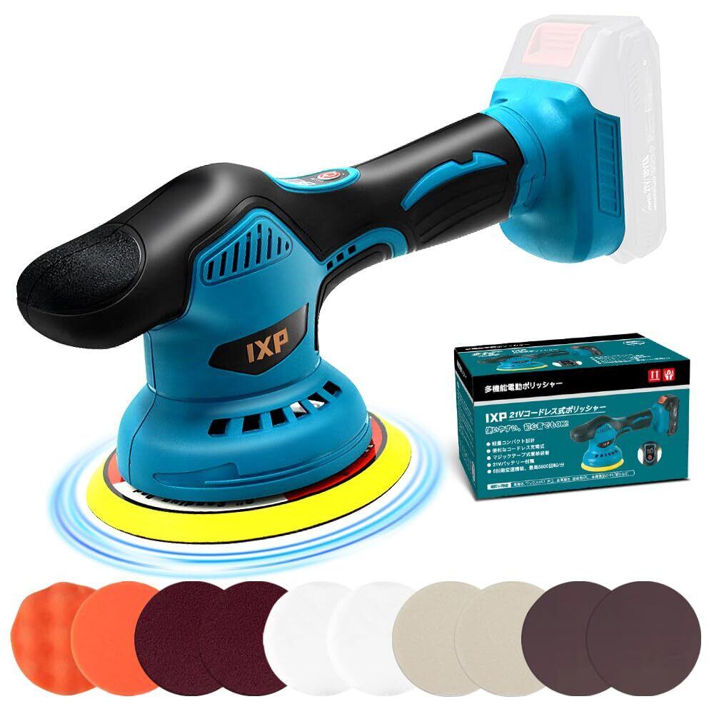 【特別価格】IXP ポリッシャー 車 150mmバフ ダブルアクション 8段階変速 和式バフ付き 21V/18V 電動ポリッシャー マキタ18Vバッテリー対応可能 2800-5500RPM コードレス 充電式 偏心構造 残量表示付き 研磨機 洗車 車磨き 傷消し 艶出し 鏡面磨き 研磨 ワックス作業 家庭用 【バッテリ一なし】