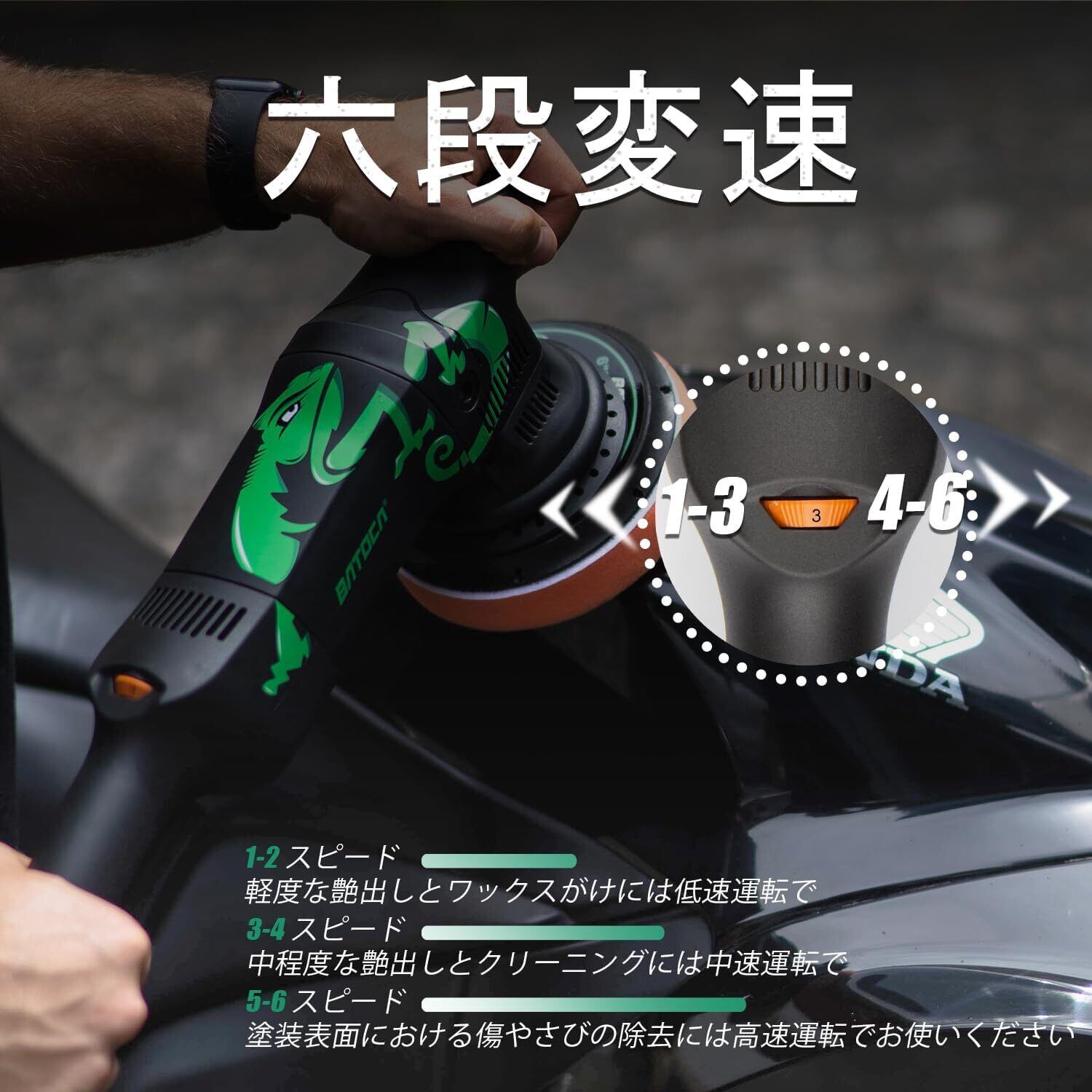 【多機能設計|素材選ばず6段変速対応】1000-3800回転/分の6段変速で、低速(ワックス・微調整)・中速(汚れ落とし)・高速(深傷修復)を切替可能。自動車ボディ、金属、木工、大理石、浴室タイルなど多素材に適用。