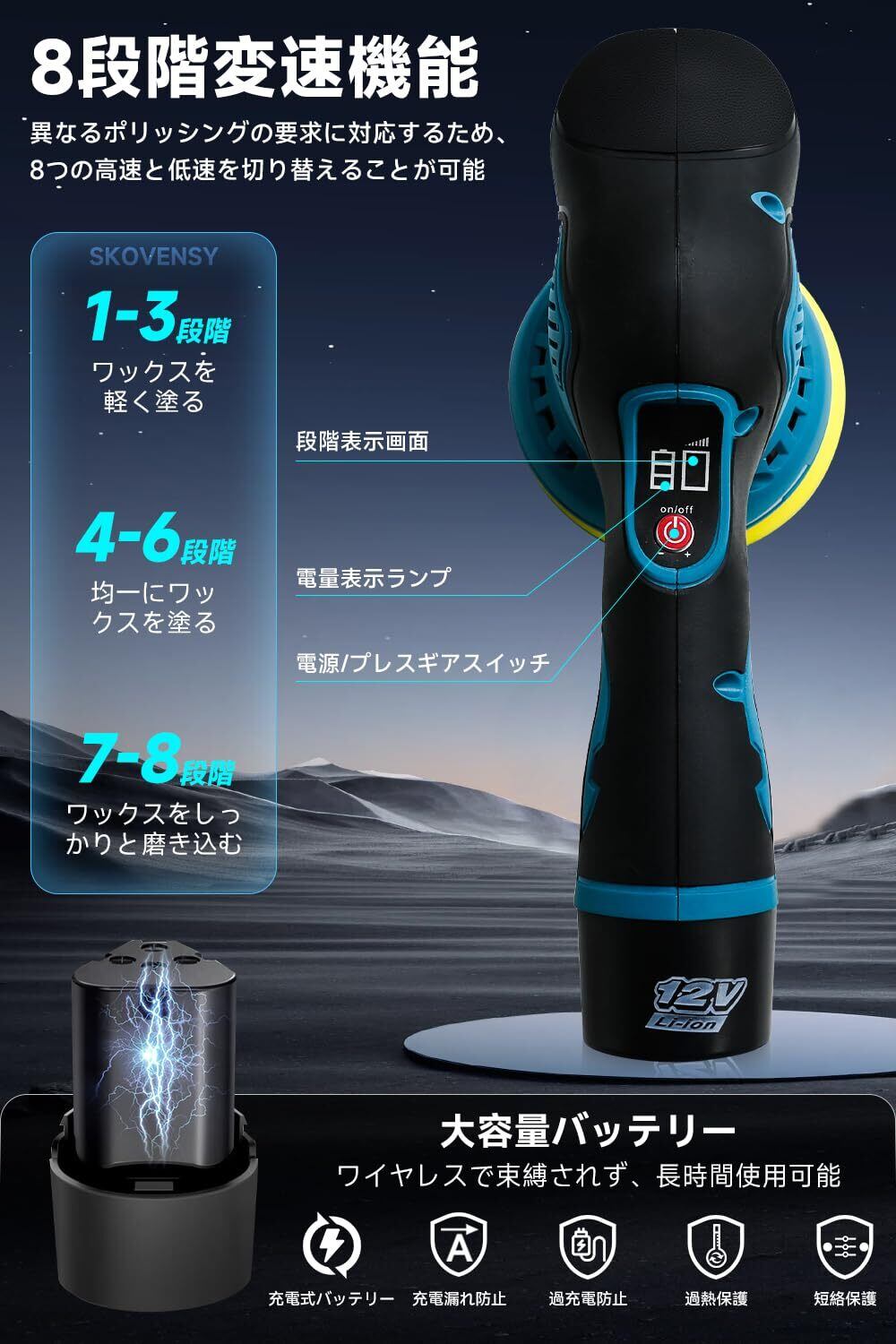 【2つのバッテリーとバッテリーレベル表示を備えた大容量】:このワイヤレスポリッシャーは、2つの高容量12Vバッテリーを搭載し、長時間の使用と持続的なパフォーマンスを提供します。充電のための頻繁な中断を減らし、作業中の連続性と効率を確保します。ポリッシャーのバッテリーレベル表示により、いつでも電力消費を監視でき、信頼性と便利さを提供します