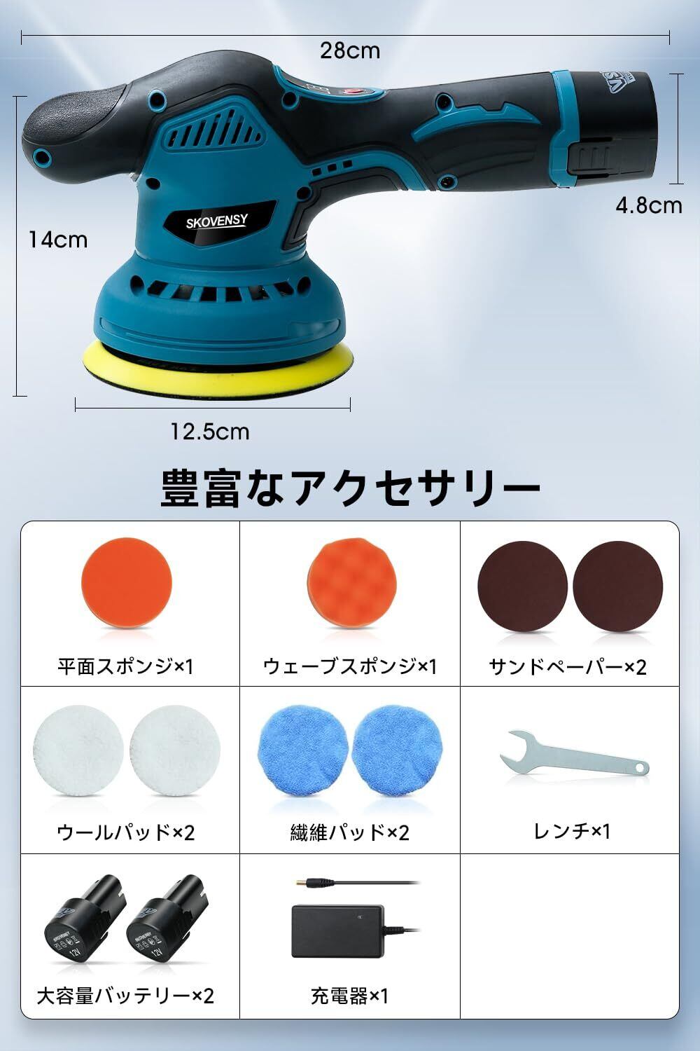 ポリッシャー 充電式 ダブルアクション 充電式ポリッシャー 大容量バッテリ一2個搭載 電動ポリッシャー ポリッシャー 車 コードレスポリッシャー ブルー